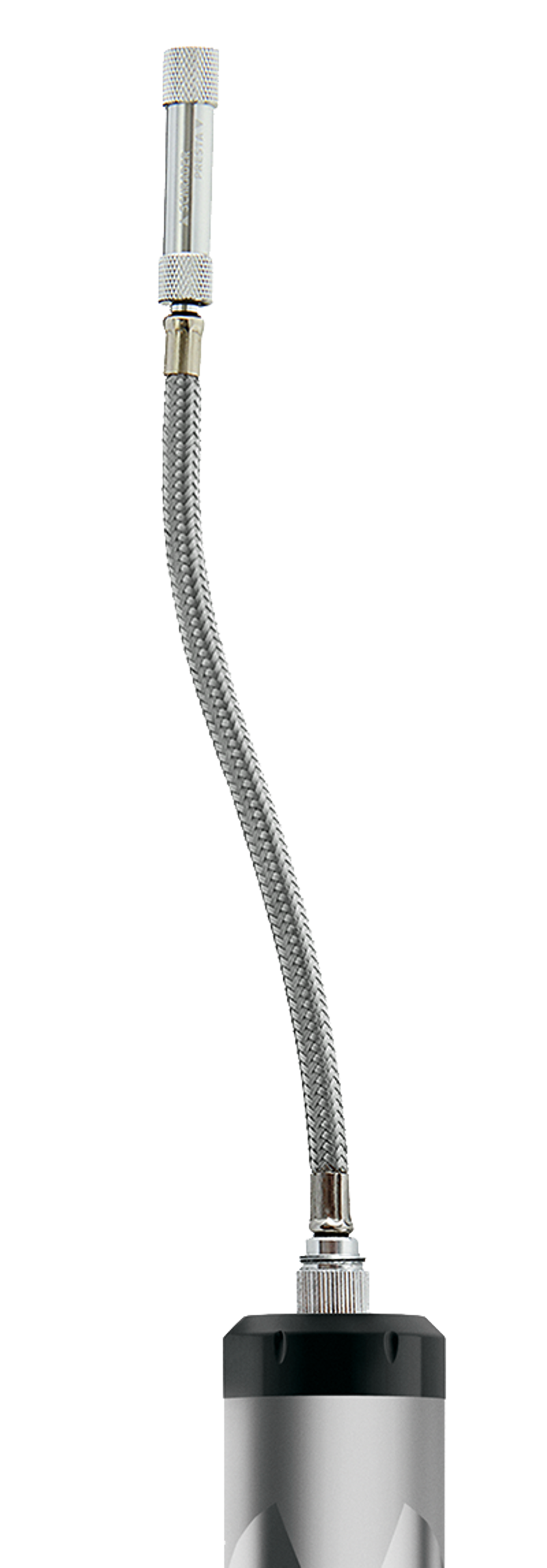 • A threaded, adaptable chuck offers dual valve compatibility without the need to detach the extendable braided hose from from the pump