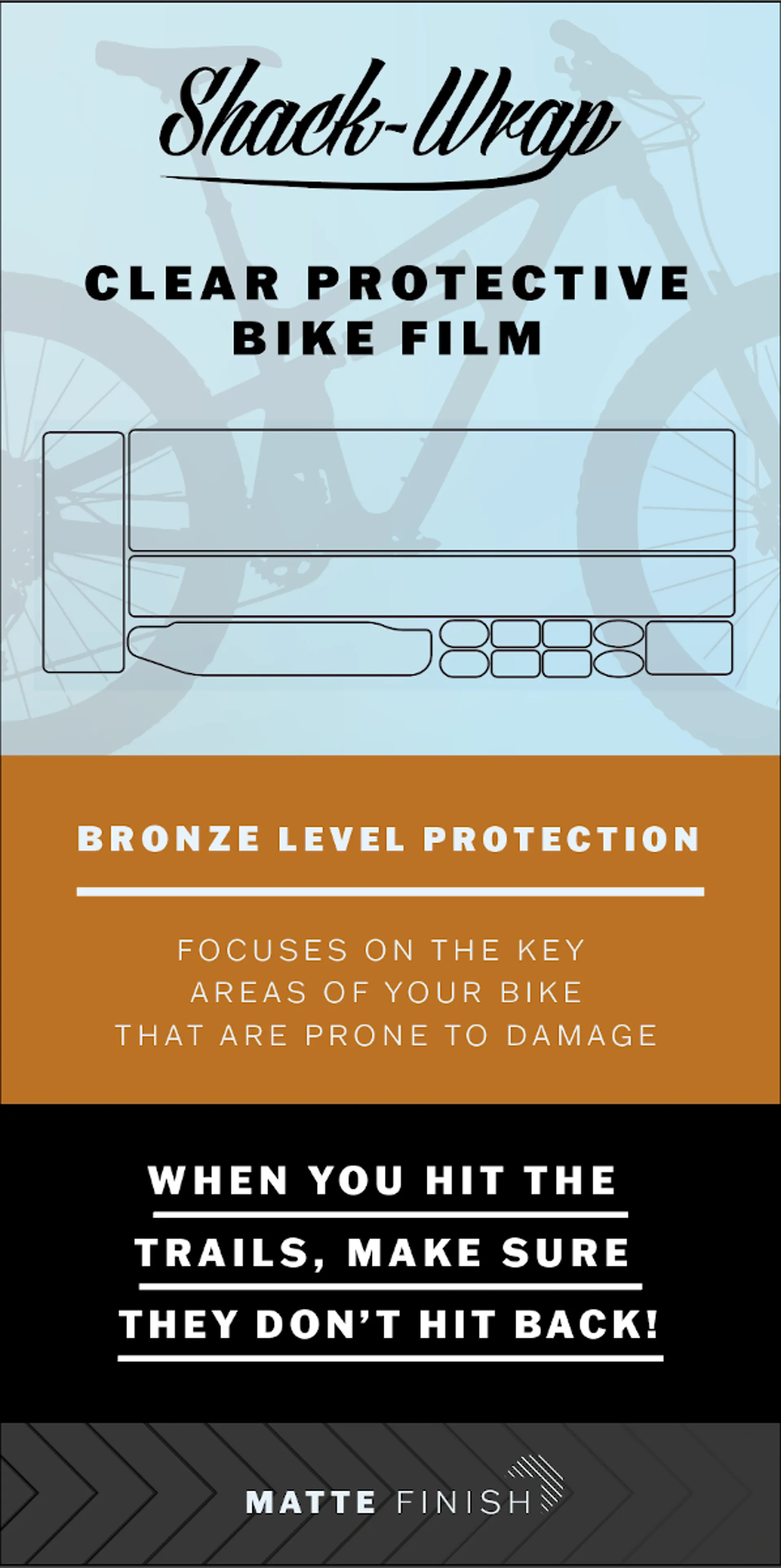 The Shack Wrap Bronze Protection Kit focuses on the key areas of your bike that are prone to damage. Offering protection to the top tube, down tube, chainstay and cable rub areas.