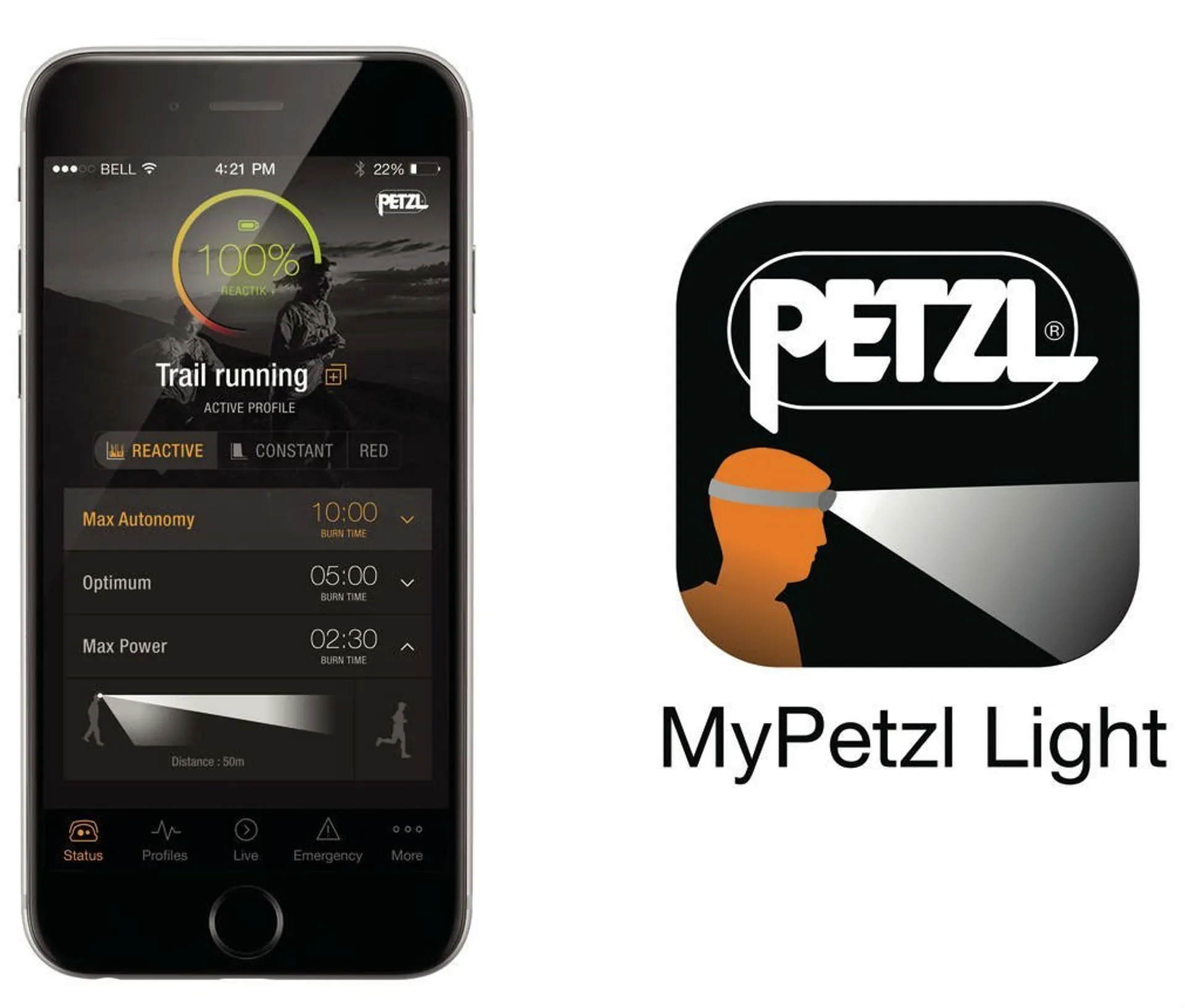 • Customized beam pattern, burn time and brightness, thanks to the MyPetzl Light for smart phone and tablet (free download at App Store and Google Play):
