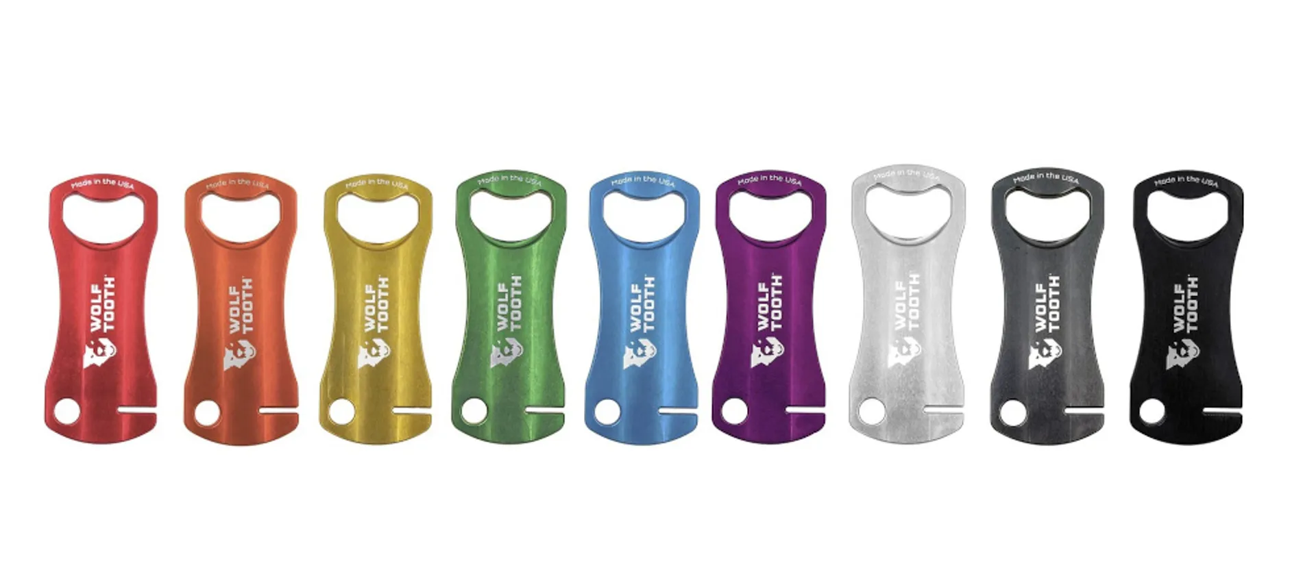 The Wolf Tooth Bottle Opener grips the bottle cap like a wolf on prey and pops it right off every time! We even added a slot for truing your brake rotors and a large hole for a keychain or carabiner. This is not just some generic opener we selected from a catalog – this is a precision engineered tool that you will want to have with you all the time. It's weight is a mere 32g so you can carry it with you wherever you go (even on the bike).