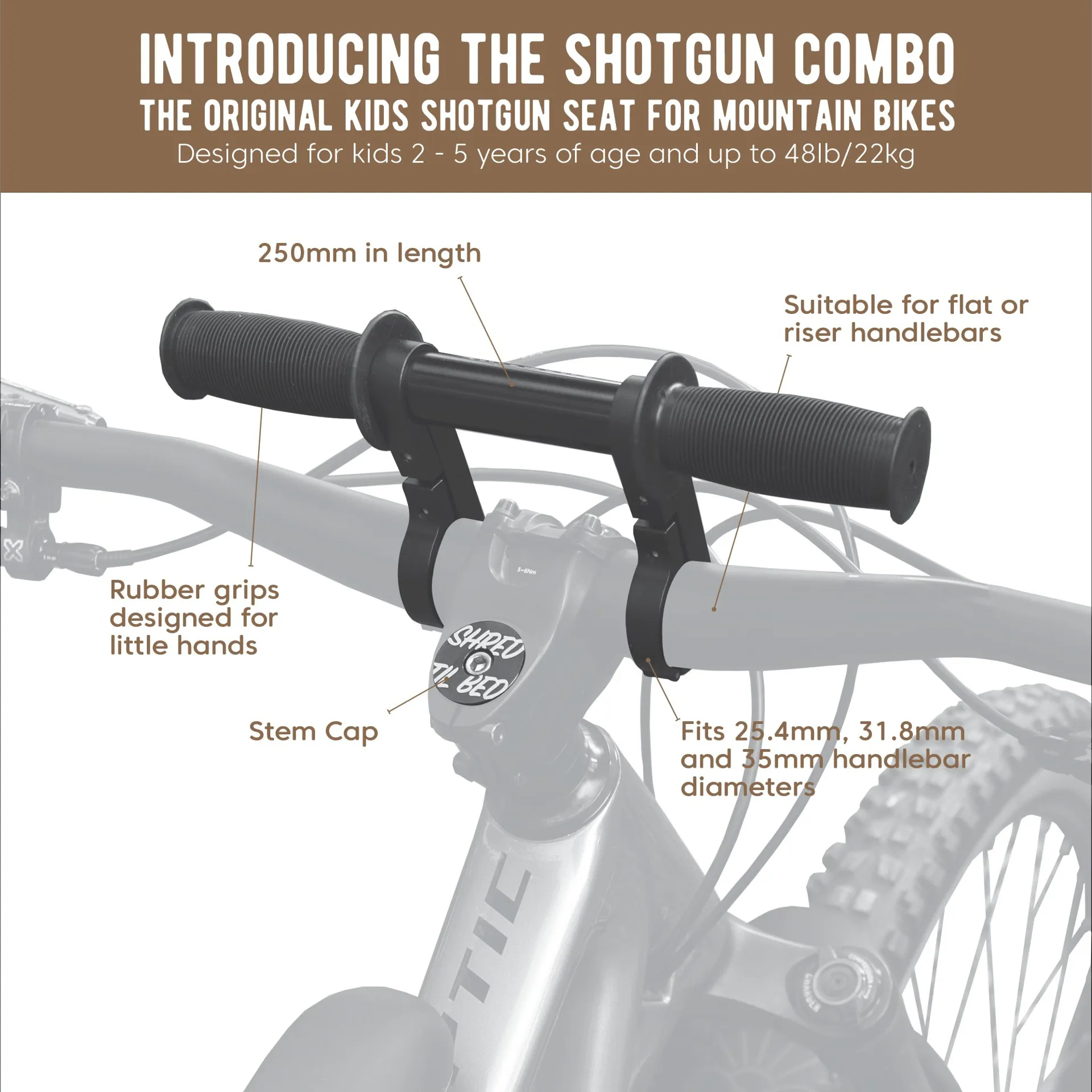 The Shotgun Kids Seat and Handlebar Combo is the ultimate setup for your mountain bike kid. Not only will you get the Shotgun seat and handlebar accessory, you'll also get the custom mudguard and one of a kind 'shred til bed' stem-cap too!