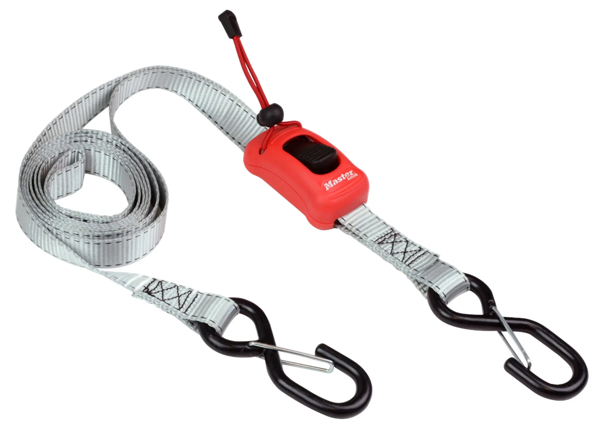 The Master Lock Spring Clamp Tie Down Strap has no fiddly setup, it’s ready to use! Adjust the length of the strap by using the easy to use push button. Two S hooks with security clip keep the strap attached to the anchor points even when not under tension.