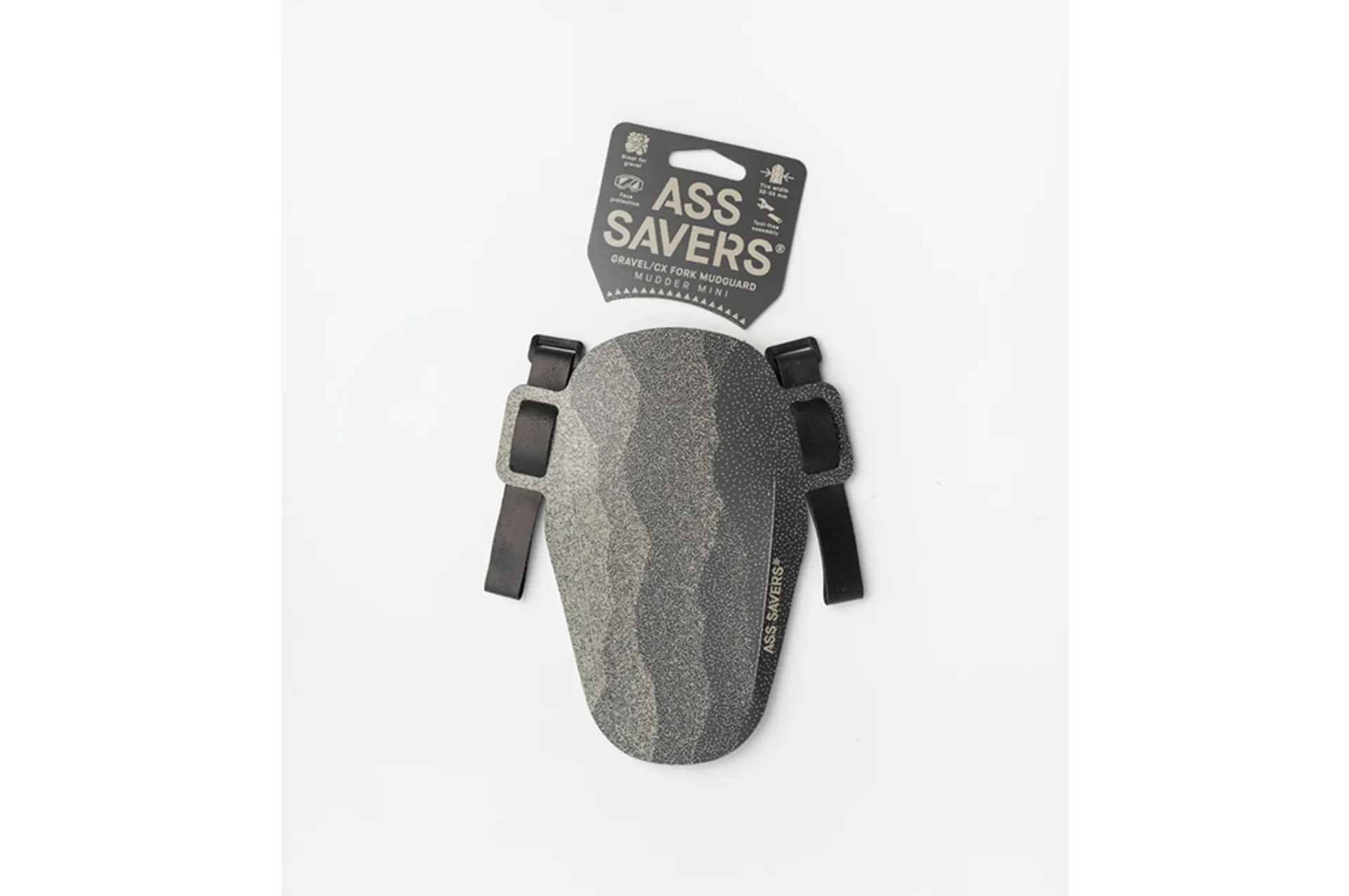 The Ass Saver Mudder Mini Mudguard is here to offer relief for your face and headset bearing. Simply mount it to your fork legs just above your front tire and you will dramatically reduce the amount of spray in the critical areas. The MUDDER Mini attaches with innovative adjustable anti-slip straps to guarantee an instant and perfect fit on all fork sizes. Please make sure you have at least 8 mm side clearance between fork blade and tyre wall in order to safely fit the MUDDER Mini.