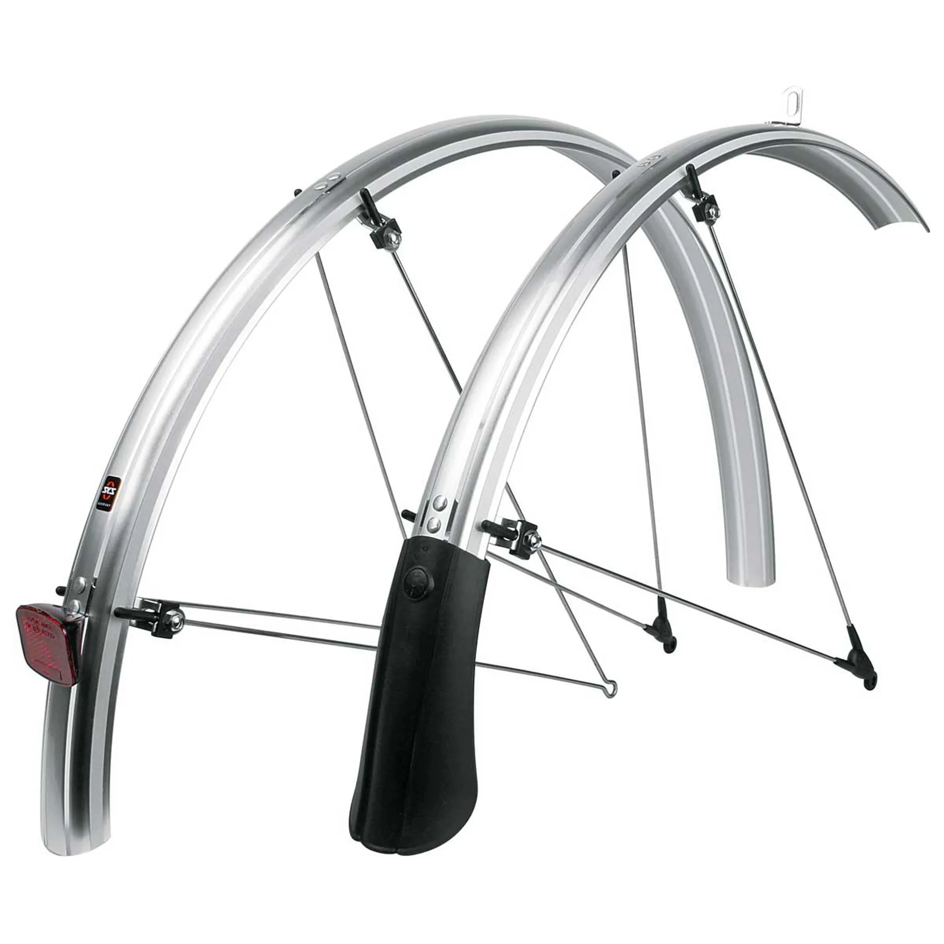 With its shiny black surface and black fastening components, the SKS Bluemels Mudguard Set also leaves nothing to be desired in terms of appearance. The ASR safety system uncouples the stays should branches become trapped between the spokes, so the wheel is unable to jam. The V-stays with fixed bridges guarantee individual adjustment. The bottom bracket cutouts make mounting possible even when installation clearance is small. Includes accessories and stays.