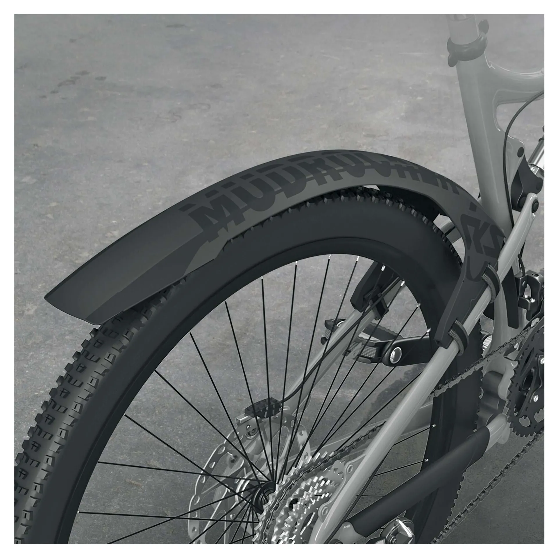 The MUDROCKER rear perfectly deflects dirt and spray water and is suitable for full suspension bikes and bikes with a dropper seat post. It mounts onto the rear stays with rubberised hook and loop fasteners and soft mounting brackets protect the frame, these can be rotated and used in two different positions for height adjustment allowing you to choose how close the MUDROCKER is to the rear tyre.