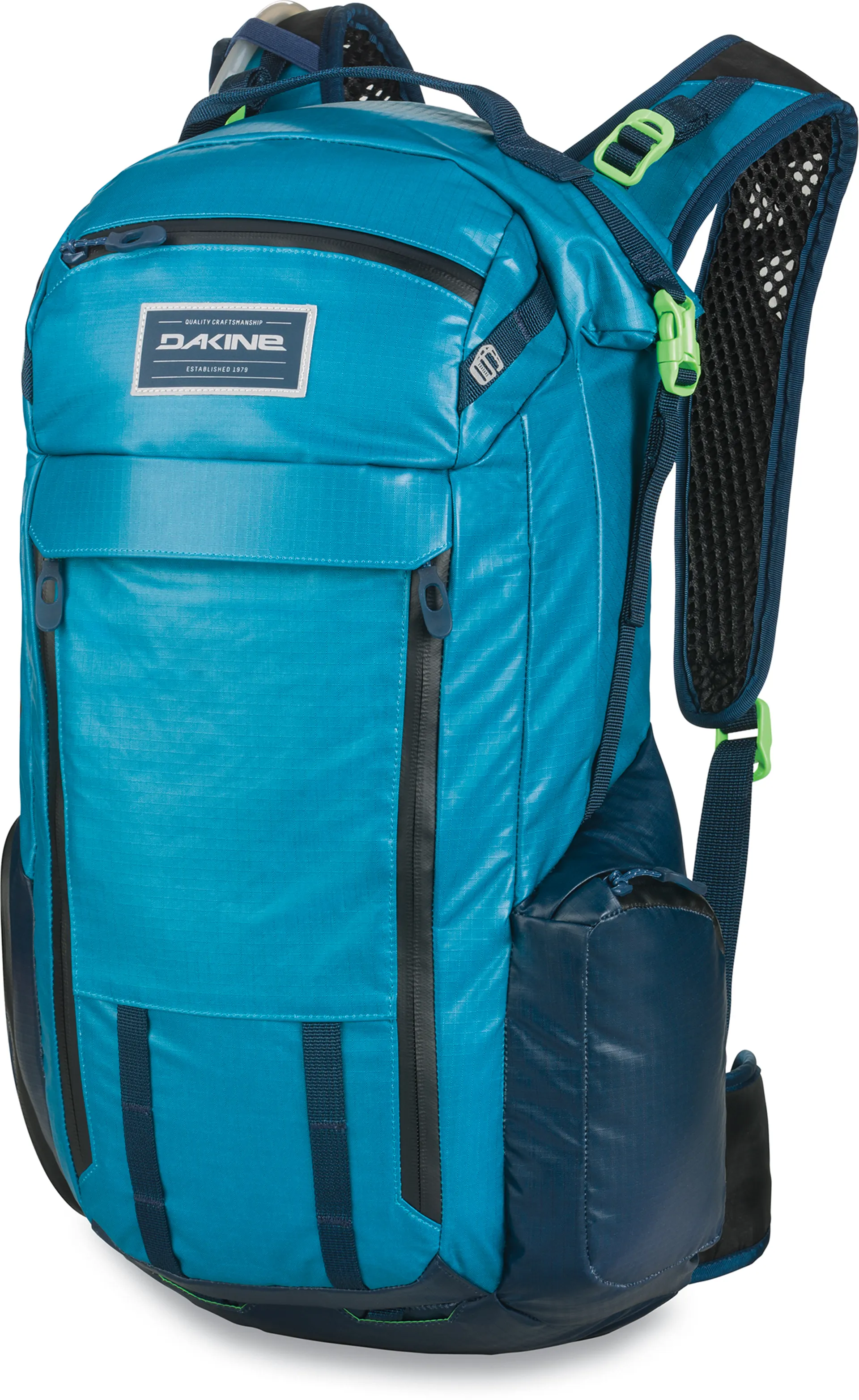 The Dakine Seeker 15L Hydration Backpack.The Seeker 15 Liter is the ultimate all-season adventure mountain biking backpack whether single day or multiday. This weatherproof pack keeps your gear dry through the winter snow or spring rain showers thanks to the rolltop design and weather-resistant coating. When the heat turns up, you'll appreciate the cooling effect of the ventilated air suspension back panel and the breathable ergonomic shoulder straps. The 3-liter lower Hydrapak lumbar reservoir keeps water weight low on your back to maintain an overall lower center of gravity. This well-thought out pack features plenty of organization including spine protection compatibility, deployable helmet carry, side access pockets, and plenty of easy-access stash pockets to get at your goods in motion or at trail's end.