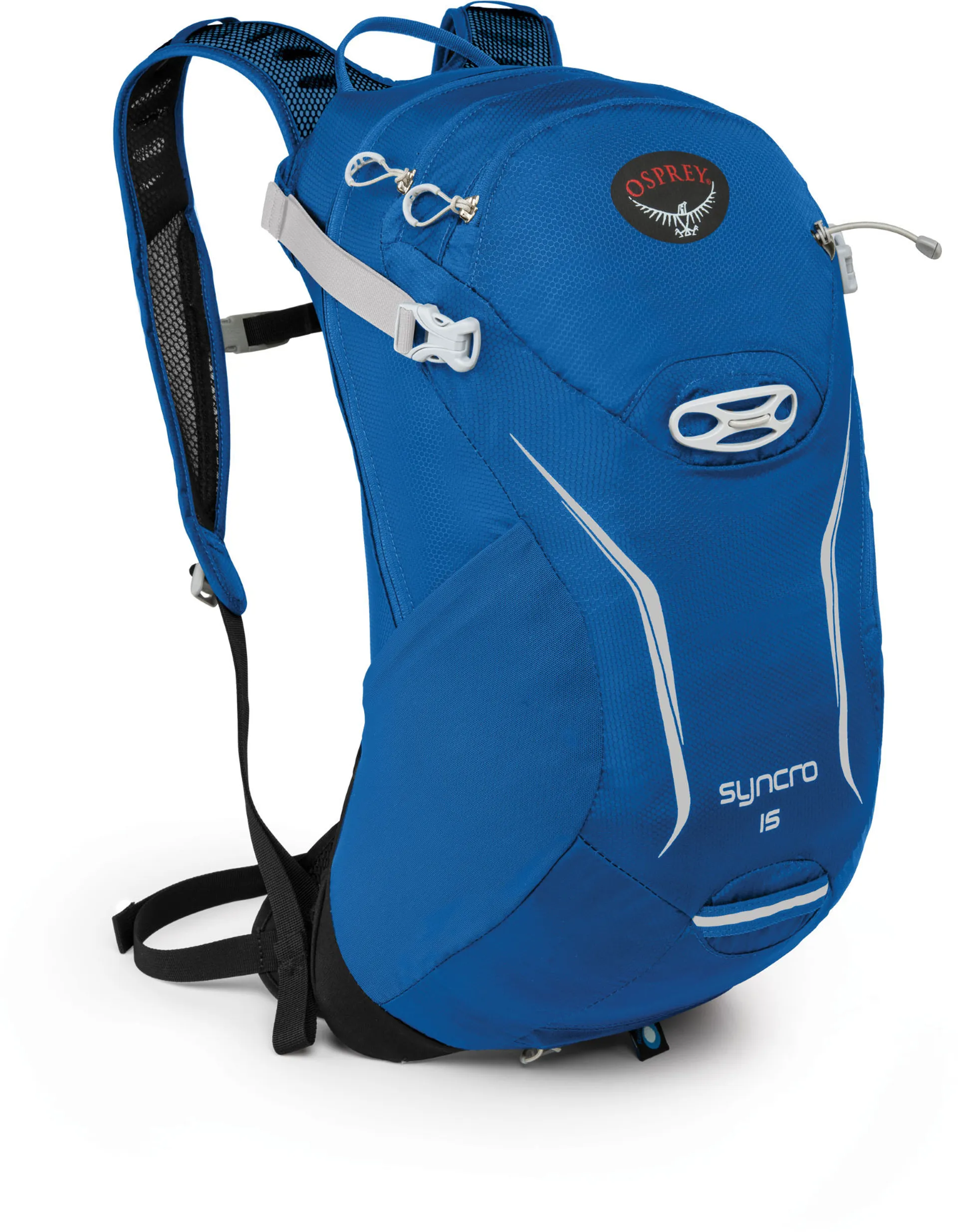 The Osprey Syncro 15 Hydration Pack offers airy ventilation and light weight with plenty of carrying capacity for multiple hours in the saddle or on the trail. The integrated rain cover keeps contents protected when conditions turn nasty. This cycling hydration pack also has stretch mesh pockets on both sides of the Syncro pack, these provide you with additional storage and keep those important essentials and gear easily accessible.  The Syncro 15 hydration pack has a roomy main compartment and an additional zippered front pocket with organizer slots, in this pocket you will be able to neatly store your tools, tubes, bike pump, camera etc. you'll never misplace those handy essentials again! This hydration pack allows you to hit the trail fully prepared for the day's journey! The hydration pack features AirSpeed suspension and a BioStretch ventilated harness, both of these attributes maximise breath-ability and help to keep you cool and comfortable all day long throughout your journey. The AirSpeed Suspension is a mesh back-panel which is supported by a LightWire frame, it has side vents and horizontal carat ridge foam backing, this is what maintains a comfortable fit on you back and keeps you cool at the same time.
