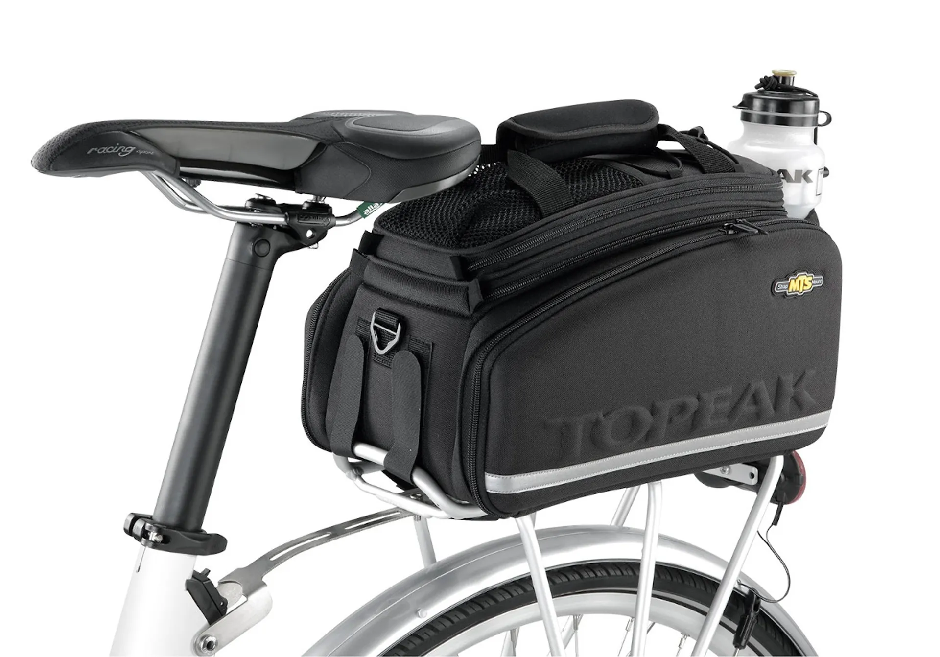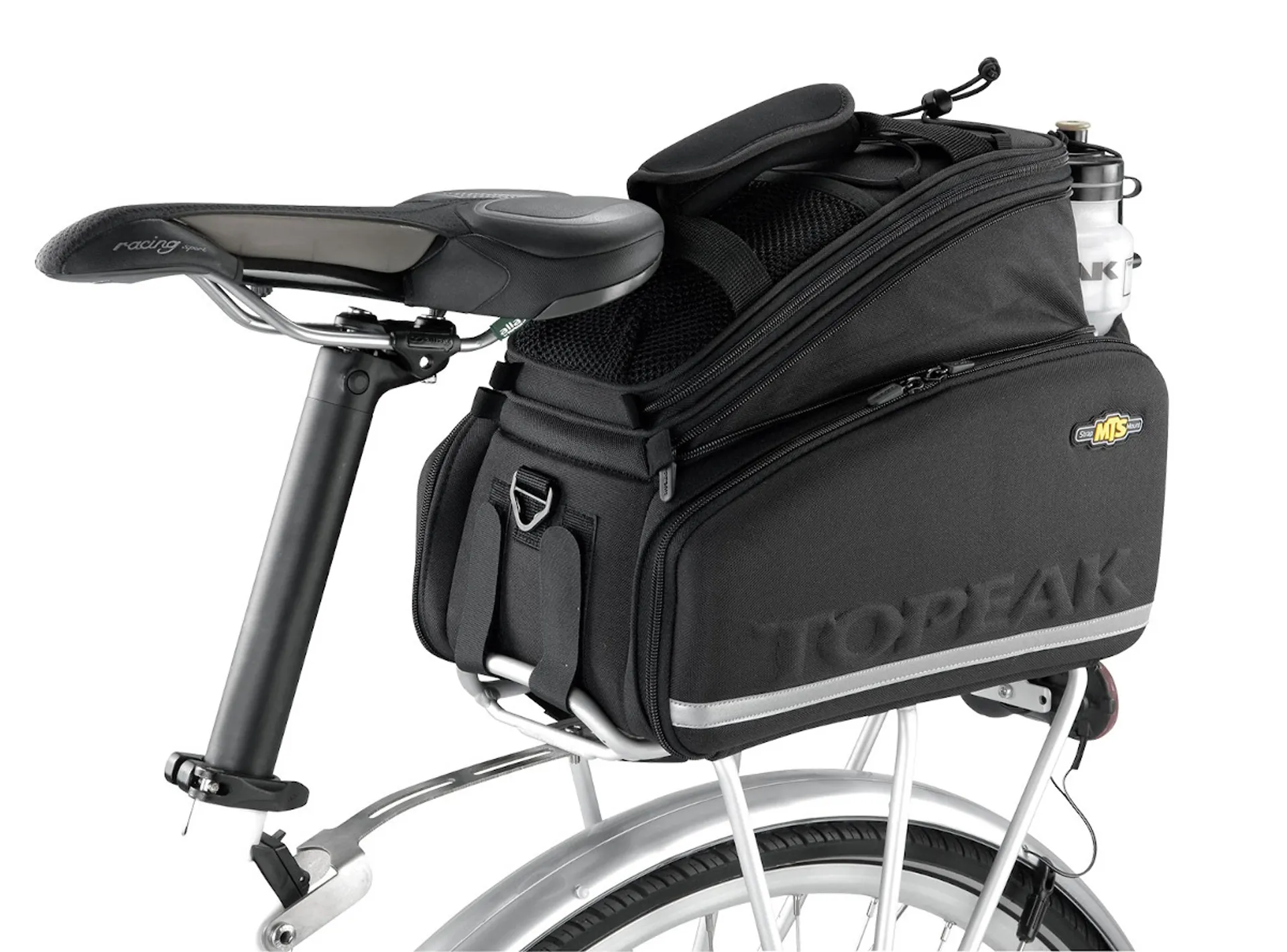TheTopeak MTS TrunkbagDXPis one ofTopeak'slargest weather resistant trunkbags. This bag is based on the popular Topeak MTX DXP, but now features Velcro mounting straps. Thedual molded side panels combine with flexible 600 denier fabric to form a semi rigid, weather resistant bag. Divided main compartment and side panels expand for extra storage capacity. Rear water bottle holder lets you carry more water on extended trips. Attaches with integrated straps. Pannier deployment requires a beam rack with side frames attached or a traditional rack with struts to prevent panniers from contacting the rear wheel.