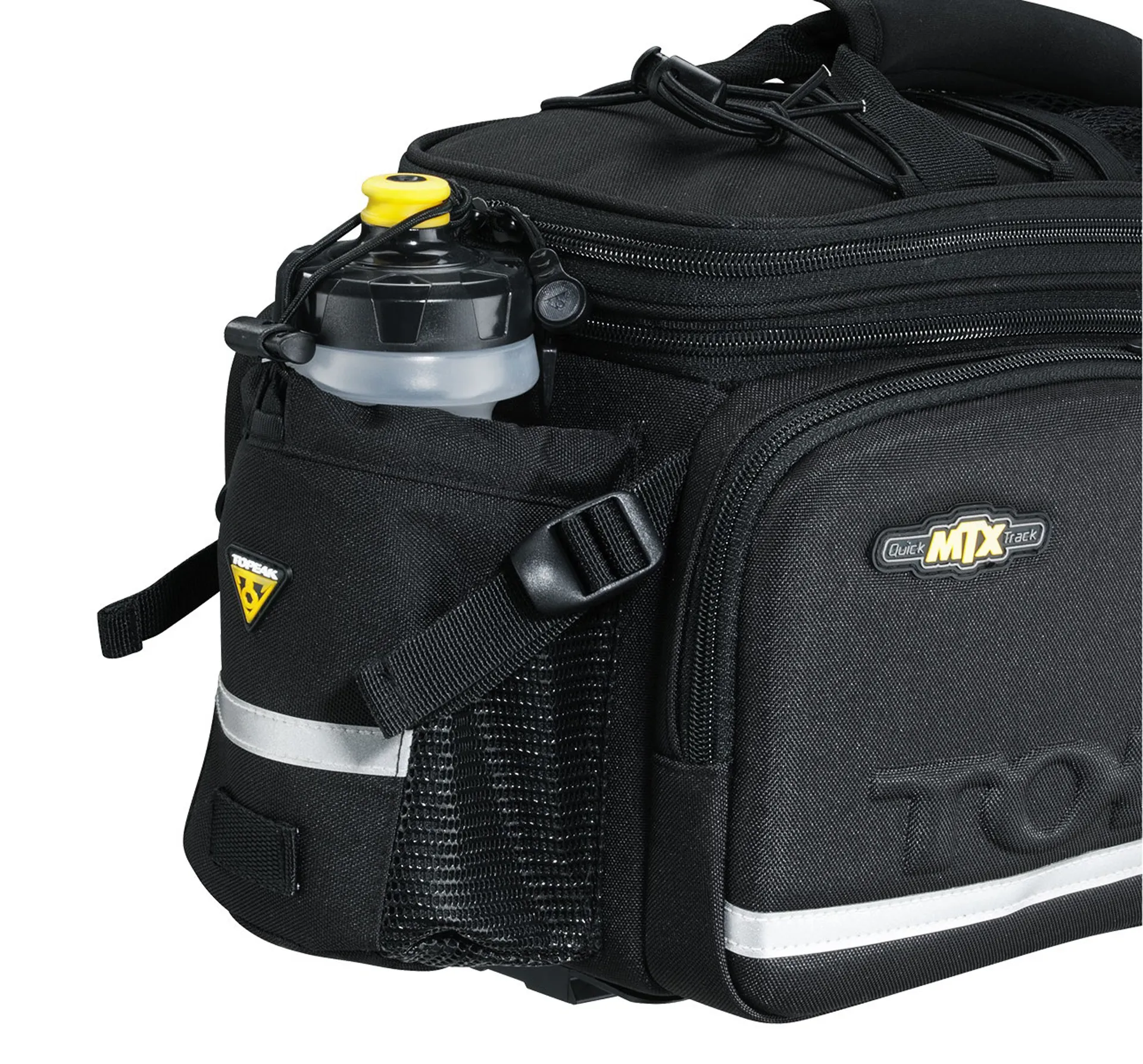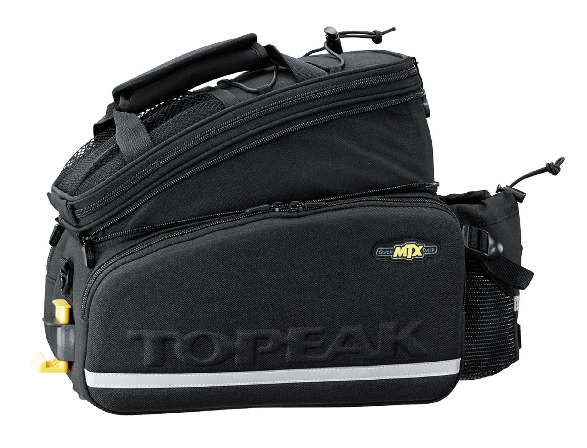 The Topeak MTX Trunk Bag DX has a divided main compartment, two zippered side pockets and rear water bottle holder. Topeak's unique construction process combines molded panels and flexible fabric for rigidity and water repellency. Compatible with all MTX QuickTrack® racks.