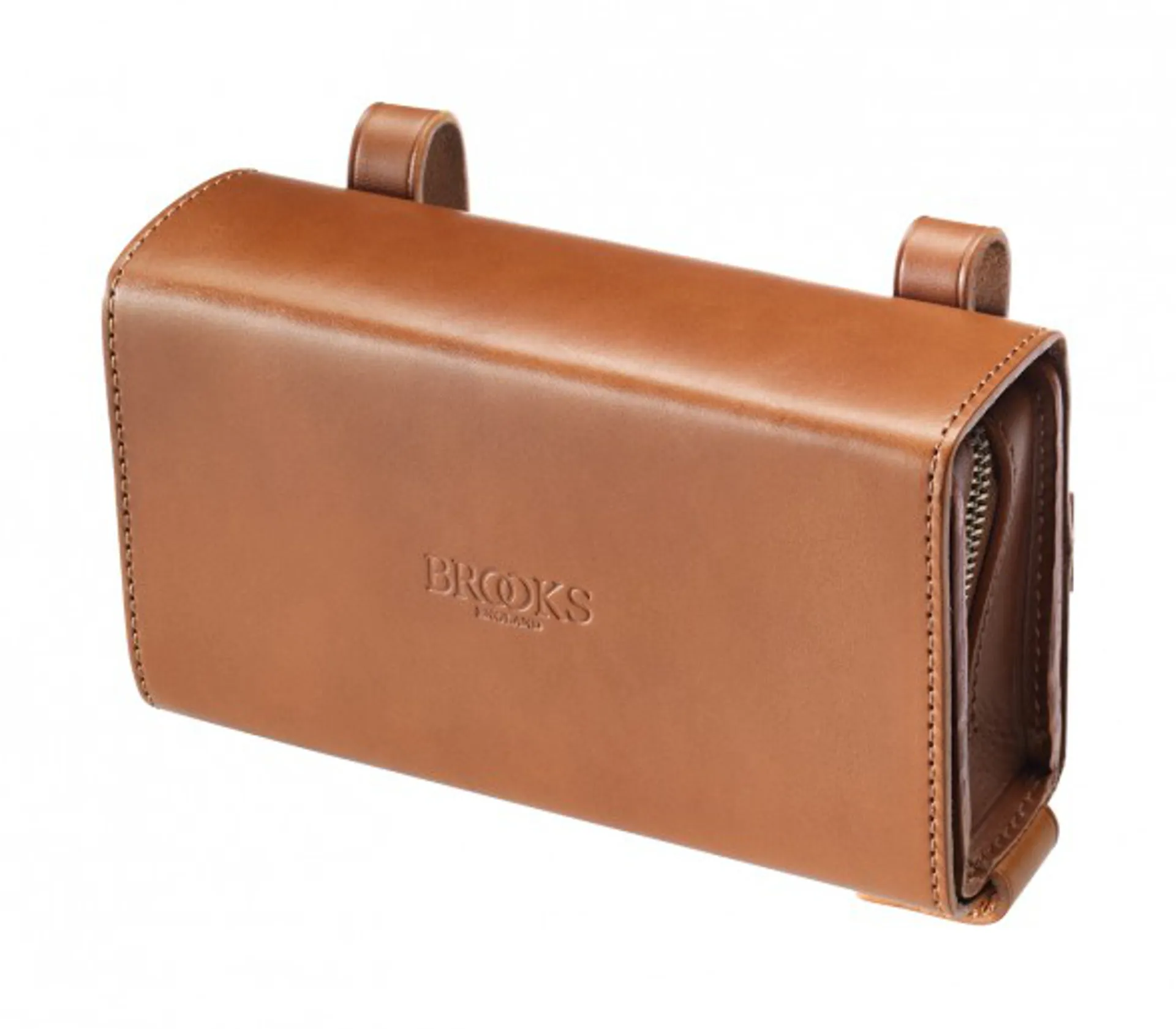The Brooks D-Shaped Bag was featured in Brooks Catalogues as far back as 1910. This innovative design features a two piece construction which, whilst the outer sleeve remains permanently attached to the saddle, has an inner purse that may be removed so that its owner may retain it, thus securing its valuable contents. The purse is attached to the sleeve by a "Sam Browne" fixing, preventing it from sliding out, even under extreme conditions.