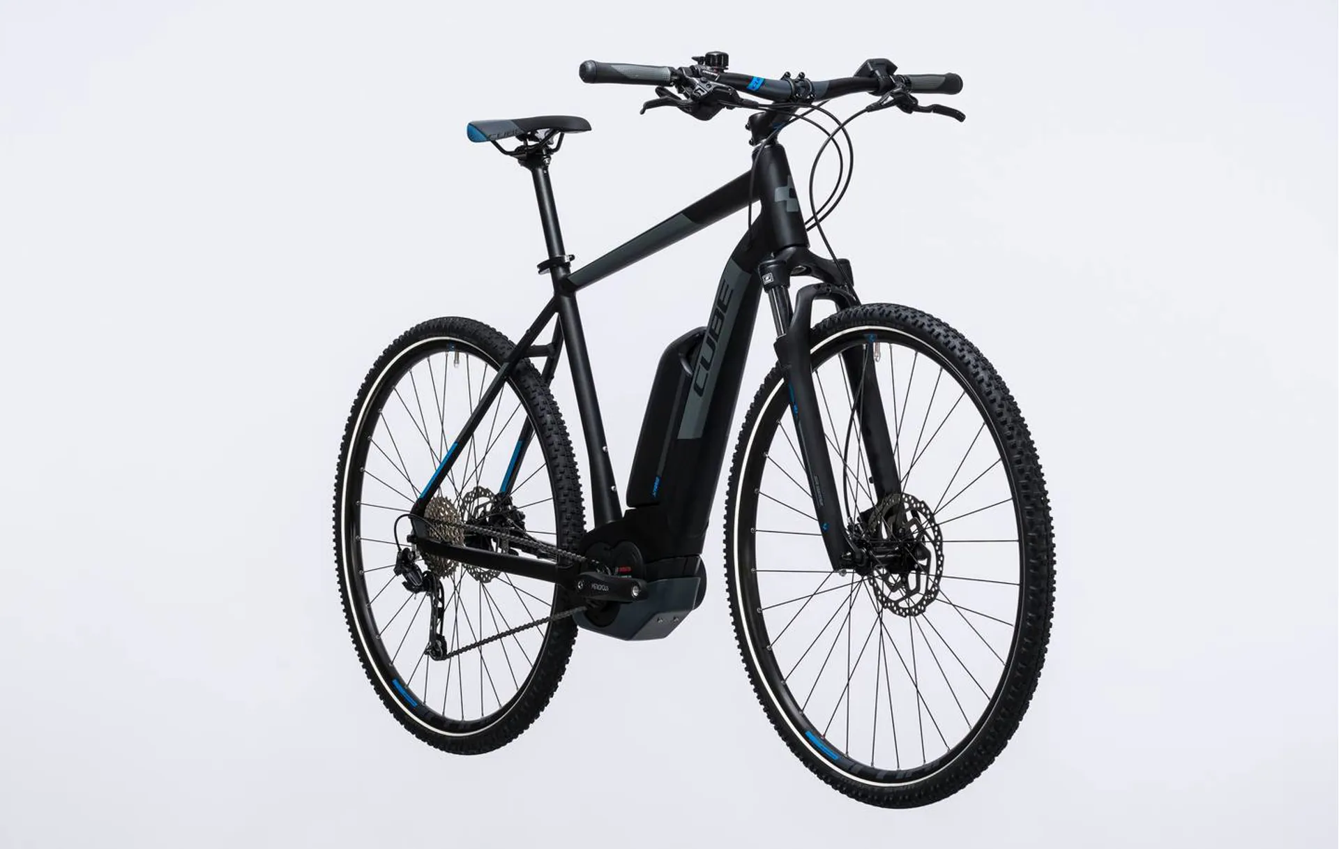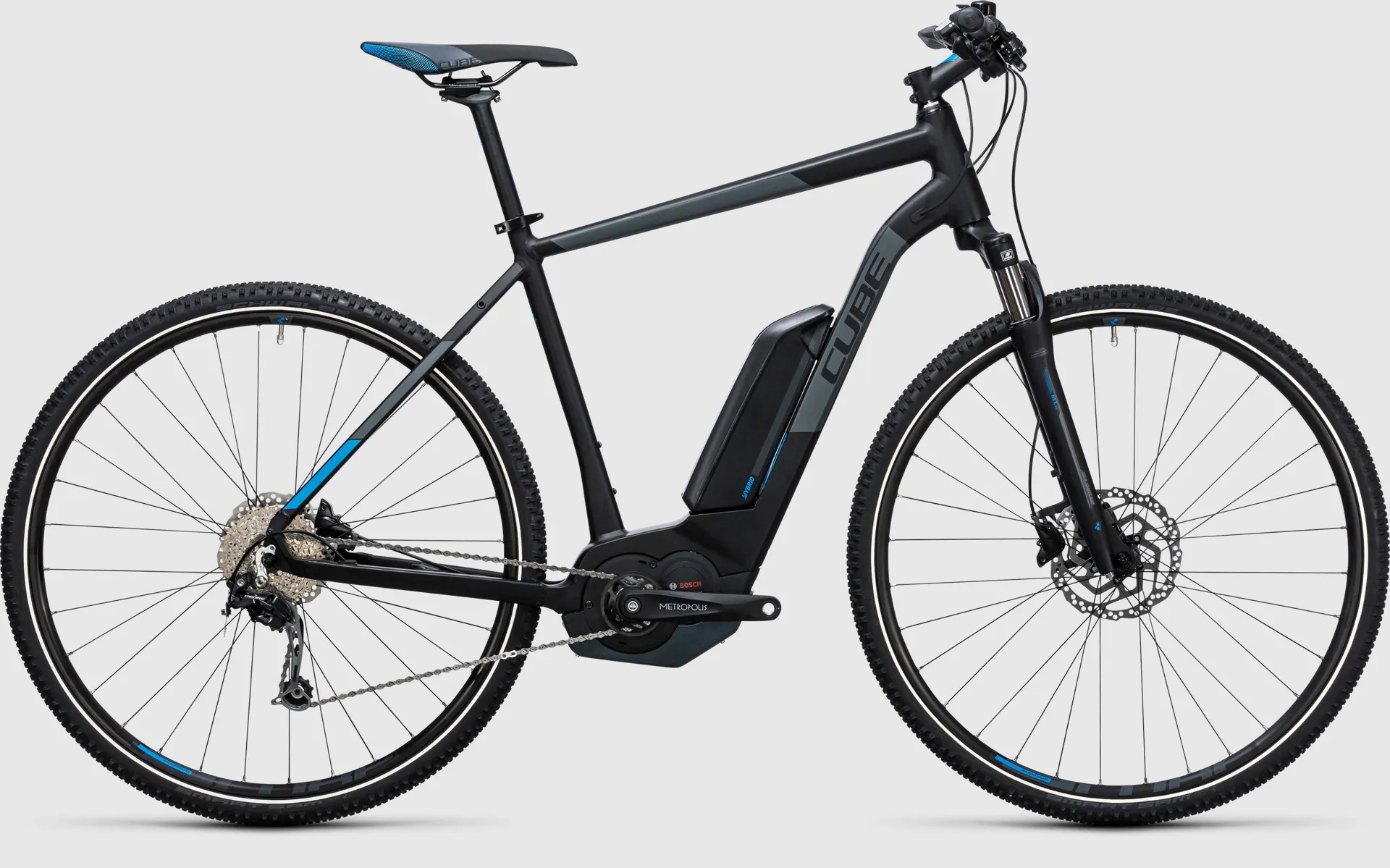The Cube Cross Hybrid Pro 400 Electric Bike 2017  is a bike for all reasons - an e-bike that'll reliably accompany you on all your cycling adventures, whether they're long rides, day-to-day use or simply a relaxed trundle in the countryside . The Bosch Performance CX motor system and robust components - including a hydraulic disc brake - make it the ideal companion for all keen cyclists. The high quality, state-of-the-art frame is the ultimate in riding safety, while the suspension fork provides extra comfort, wherever you end up riding.