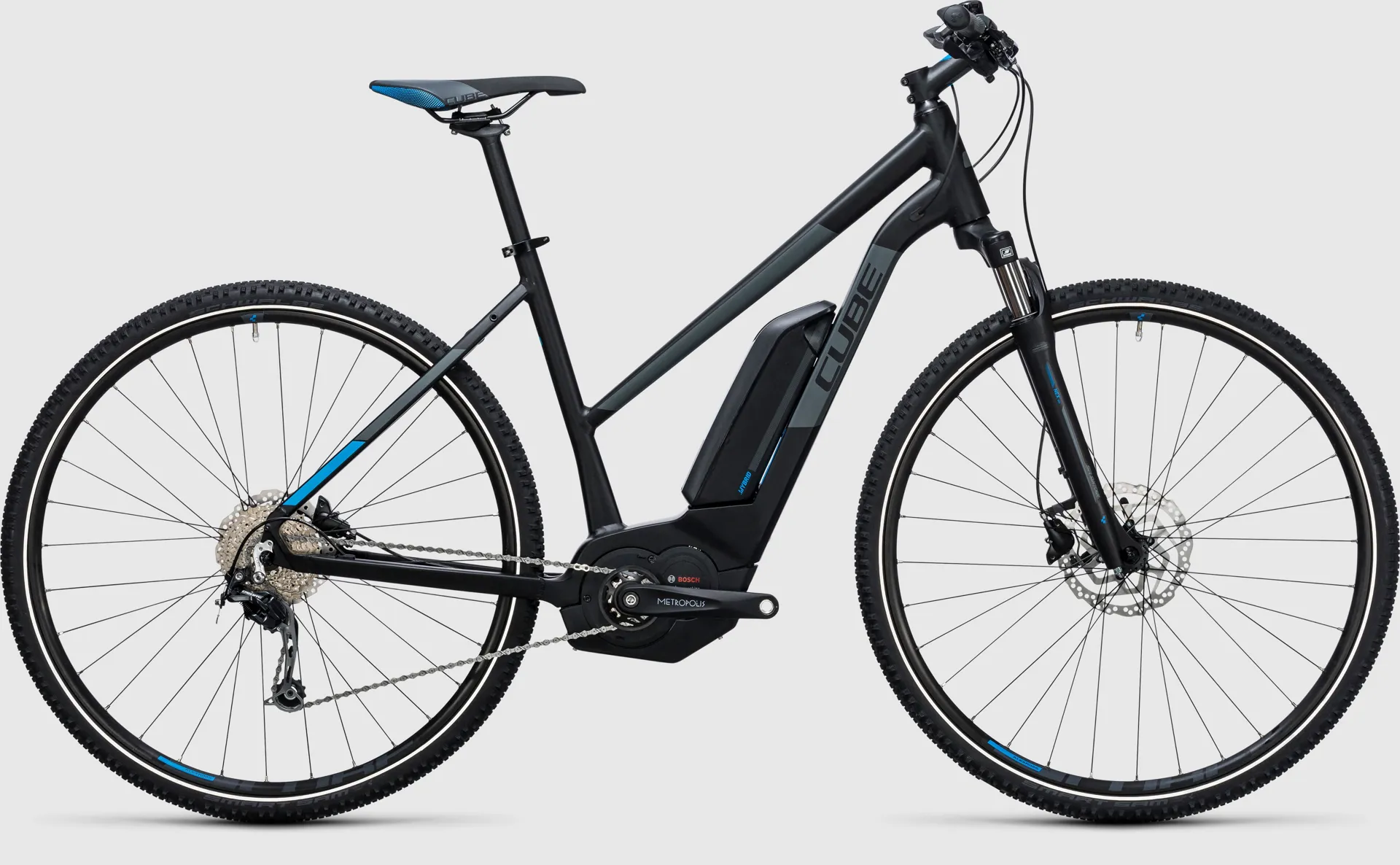 Frame: We started with a clean sheet of paper for the 2017 Cross Hybrid Pro Allroad 500. Applying everything that we've learned from building e-tour and e-MTB bikes, our engineers developed an all-new gravity casting to house the motor and battery units. Not only does this put the motor in the best possible position for efficiency and allow the battery to be recharged without removing it from the frame, but it also looks good and is immensely stiff and light, too. Whether you opt for the Trapeze or Classic Men's frame option, you'll have the benefit of internal cable routing for reducing maintenance and good looks, plus built-in rack and kickstand mounts. And, of course, the low weight and confidence-inspiring handling are exactly what you'd expect from CUBE.