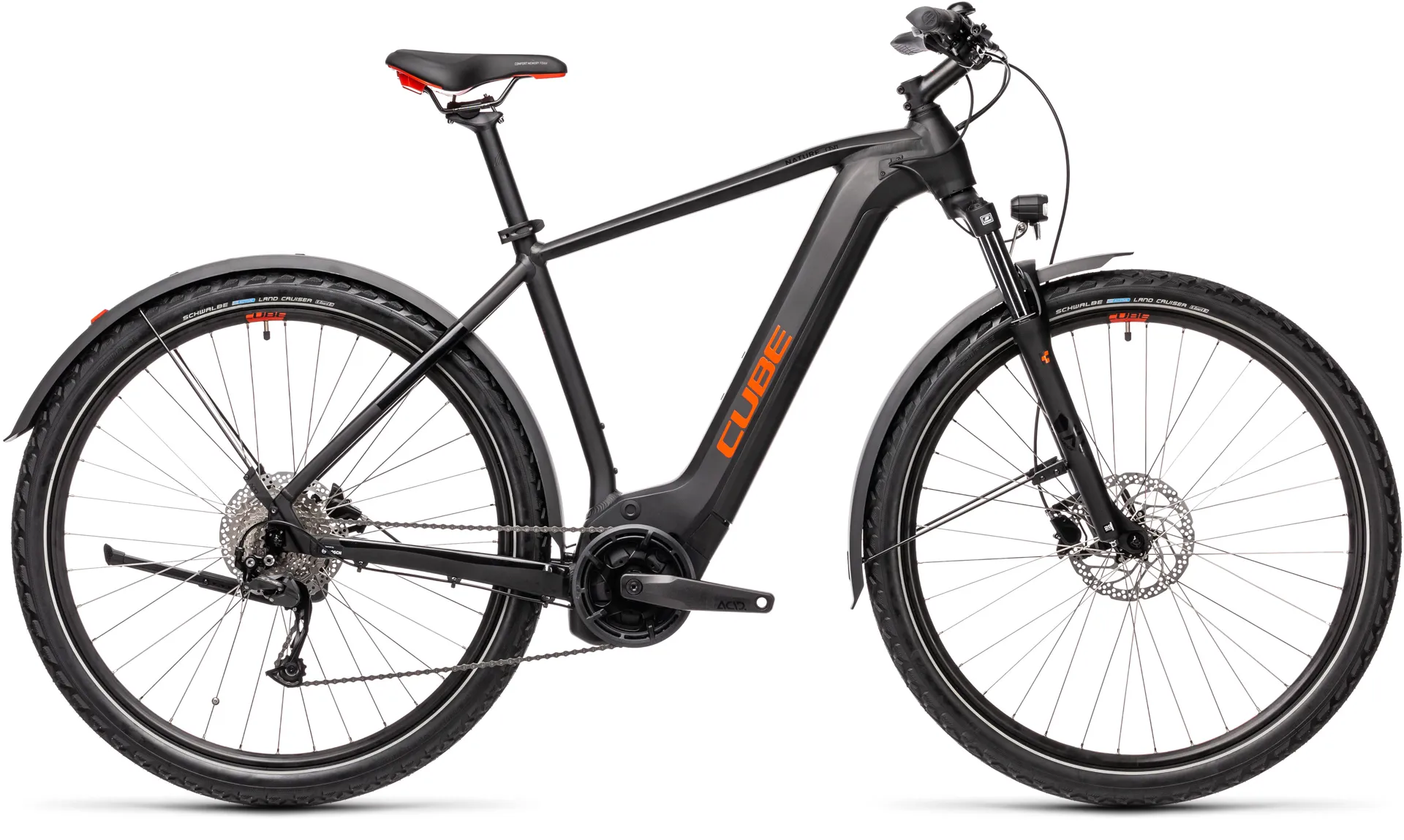 There's the reassurance of all-weather stopping safety, thanks to dependable Shimano hydraulic disc brakes. Mudguards, an integrated lighting system and kickstand add a dose of real-world practicality. And a 100mm suspension fork and grippy Schwalbe Land Cruiser tyres help smooth out rough road surfaces.