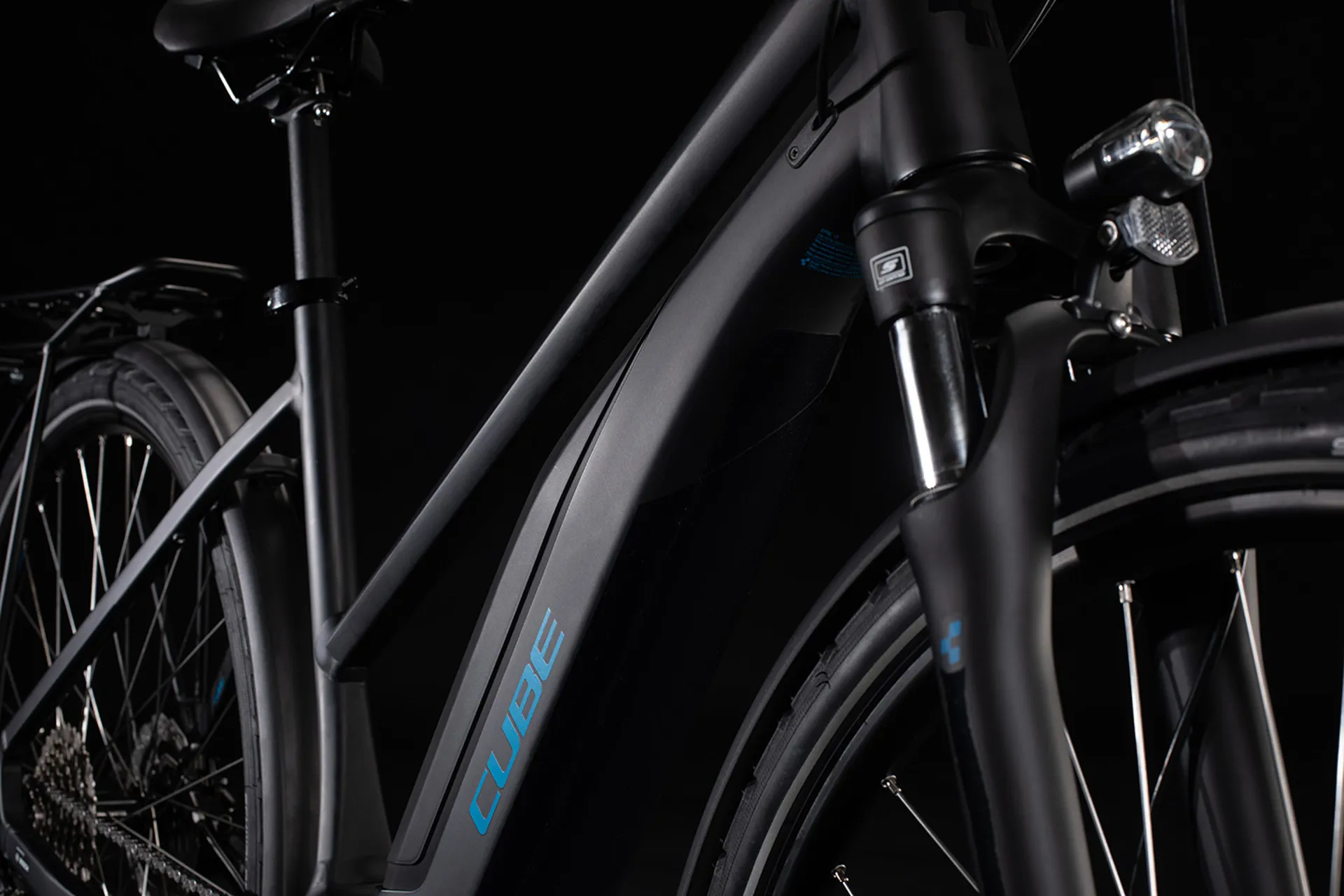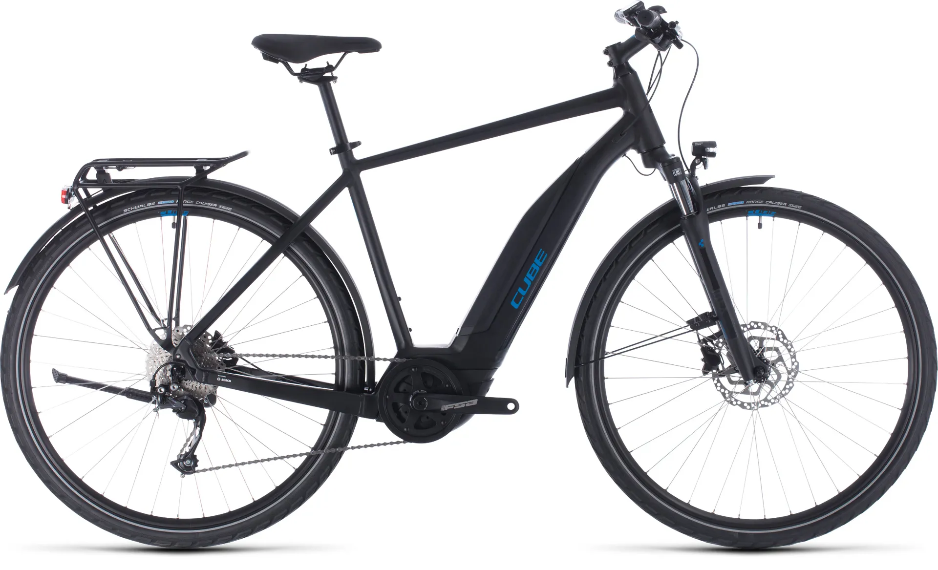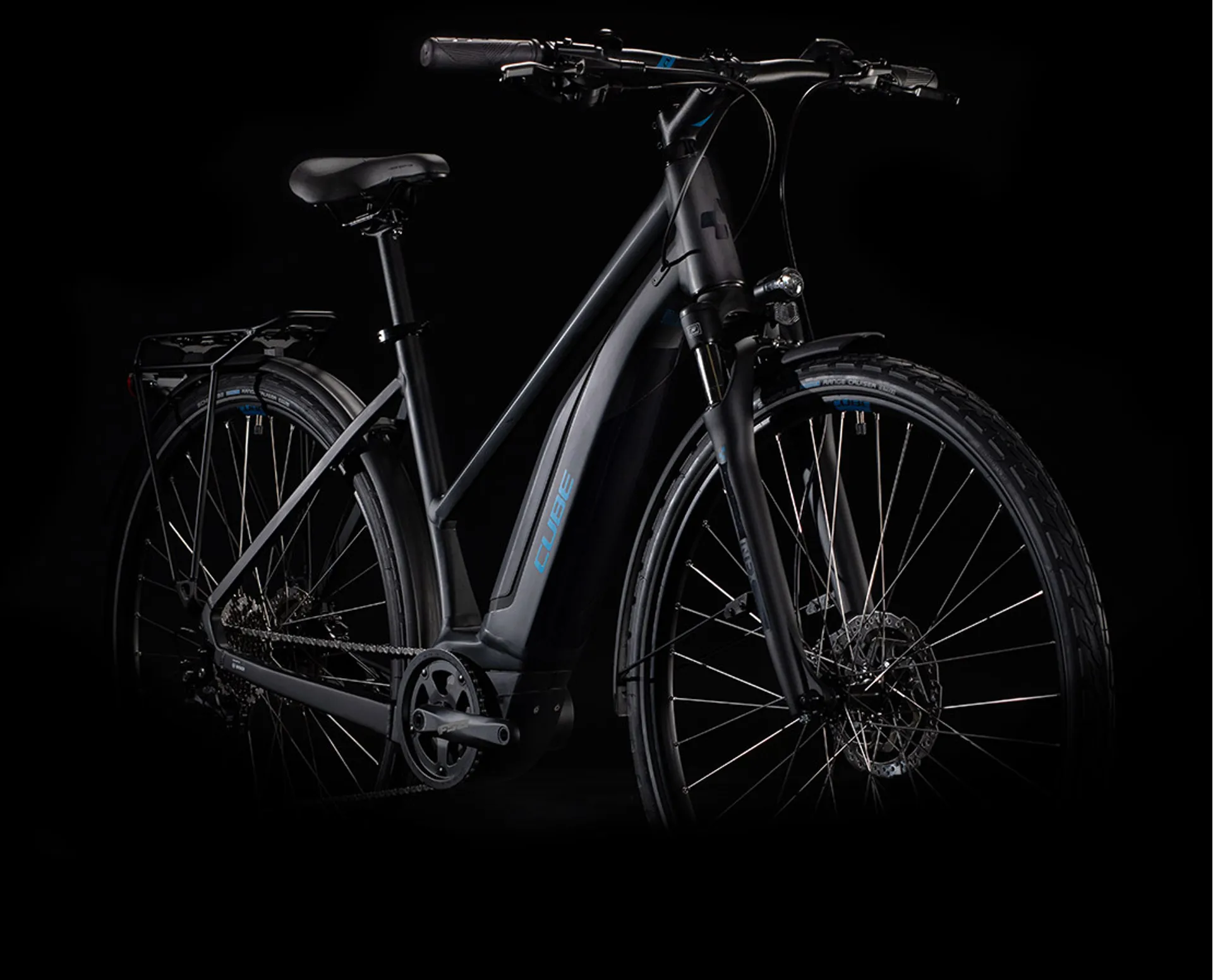 Whatever you do, wherever you go, the Cube Touring Hybrid ONE will get you there in comfort and style. Our affordable, adaptable hybrid tourer has everything you need to make riding your Bosch e-bike an absolute pleasure. Whether you opt for the Easy Entry, Trapeze or Men's version, the Cube engineers have carefully crafted the frame to ensure seamless integration of the Bosch drive unit and battery. They're in the optimum position for safe handling and sleek good looks so that, combined with our Efficient Comfort Geometry, you can rest assured that the Touring Hybrid ONE will be safe and easy to handle - and, like every CUBE bike, it's passed all  'in-house' lab tests. Smooth-shifting, easy-to-use Shimano 9-speed gears work flawlessly with Bosch's system to make every journey a breeze - and the internal cable routing ensures that the shifts will stay smooth and reliable for a long time to come, with minimal maintenance. Powerful hydraulic disc brakes offer predictable stopping in all weathers and the mudguards, lighting system, kickstand and luggage carrier ensure you're fully equipped for any eventuality.