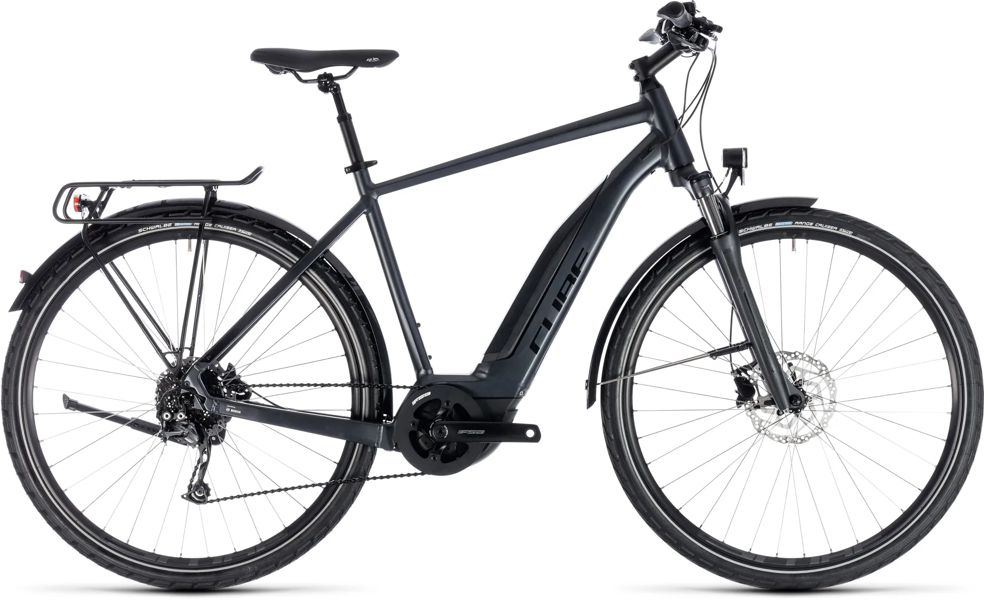 When our engineers set out to re-design the Touring Hybrid ONE's frame from the ground up, they started by moving the powerful battery into a position that improves the bike's overall stability. So, for the easy entry frame, you'll find it in front of the seat tube. On the men's and trapeze versions, it's incorporated into the sleek down tube and protected from the elements by a custom-designed cover. The Bosch drive unit is protected by a CUBE bash plate. Hydroforming tube technology allowed us to create an exceptionally light, stiff and stable frame, and we tweaked our popular Efficient Comfort Geometry to ensure that the ride position is ergonomically optimised for long rides and efficient pedalling, but with lively handling that will inspire you to go further. Smooth welds add to the modern appearance and we've even routed cables internally for clean looks and reduced maintenance. Have we thought of everything? We reckon so... so that you can concentrate on riding.
