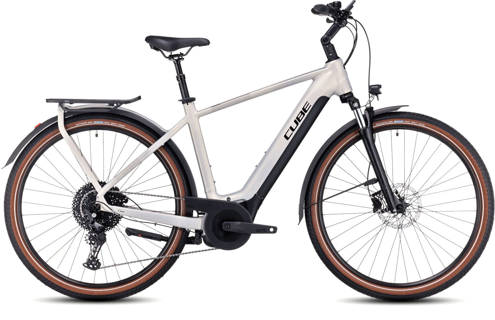 Cube made the Cube Touring Hybrid Electric Bike to be versatile, easy to live with and comfortable. The powerful Bosch Performance motor with Bosch Smart System and PowerTube battery are all so neatly integrated into the design, you'll barely notice they're there – apart from the extra help at the pedals, of course. Revised Efficient Comfort Geometry centres around a 63mm travel suspension fork for comfort and control, even on rough roads. The IC 3.0 integrated carrier is full of neat design touches to make load carrying simple, and the seat clamp even has a hidden tool in its lever. Add the new ACID chain guard, kickstand and full-length mudguards and you've got everything you need. And, with a choice of classic Men's, Trapeze or Easy Entry frame designs, there'll be a style and size that's perfect for you.