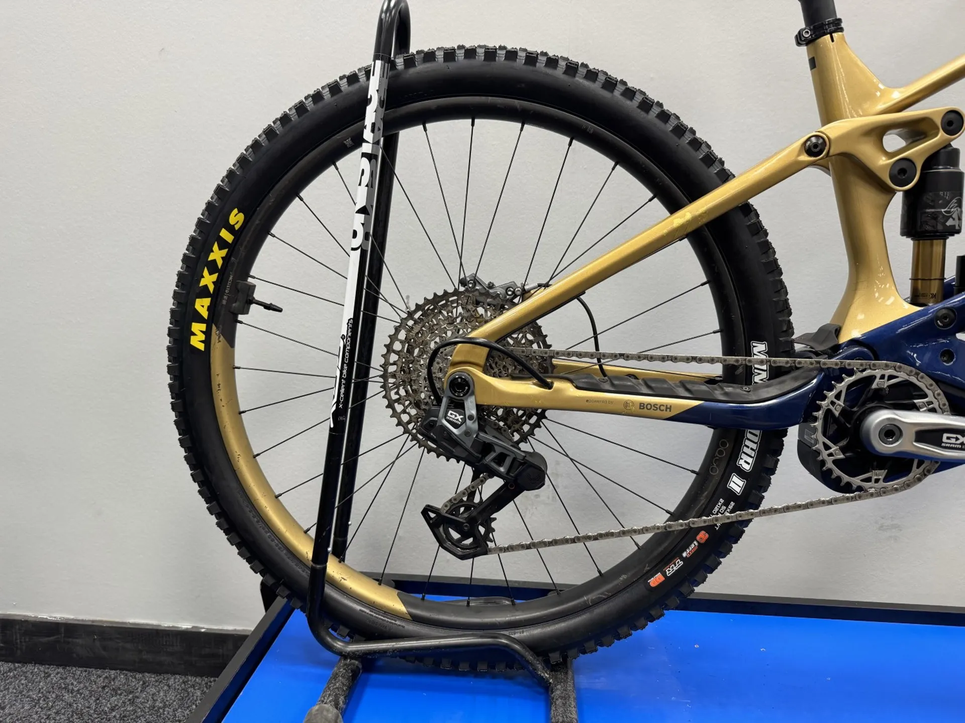 Damage Details: Known as the “Gold One”, this eye-catching custom colourway Wild is an ex-demo bike that has been fully serviced and fitted with new frame bearings. The bike shows signs of use consistent with its 1,190 miles of riding, with approximately 791 miles completed in e-MTB mode. Cosmetic wear is present throughout the frame, including damaged fork decals and general cosmetic marks. Some of these areas have been touched up by the previous rider, who rode the bike on behalf of Orbea. All wear is cosmetic only and does not affect performance. The bike is supplied with a charger for the integrated 750Wh battery, which powers the Bosch Performance Line CX Gen 4 motor, delivering 85Nm of torque. The AXS battery has been hardwired to the internal bike battery, reducing the need for an additional battery to charge.