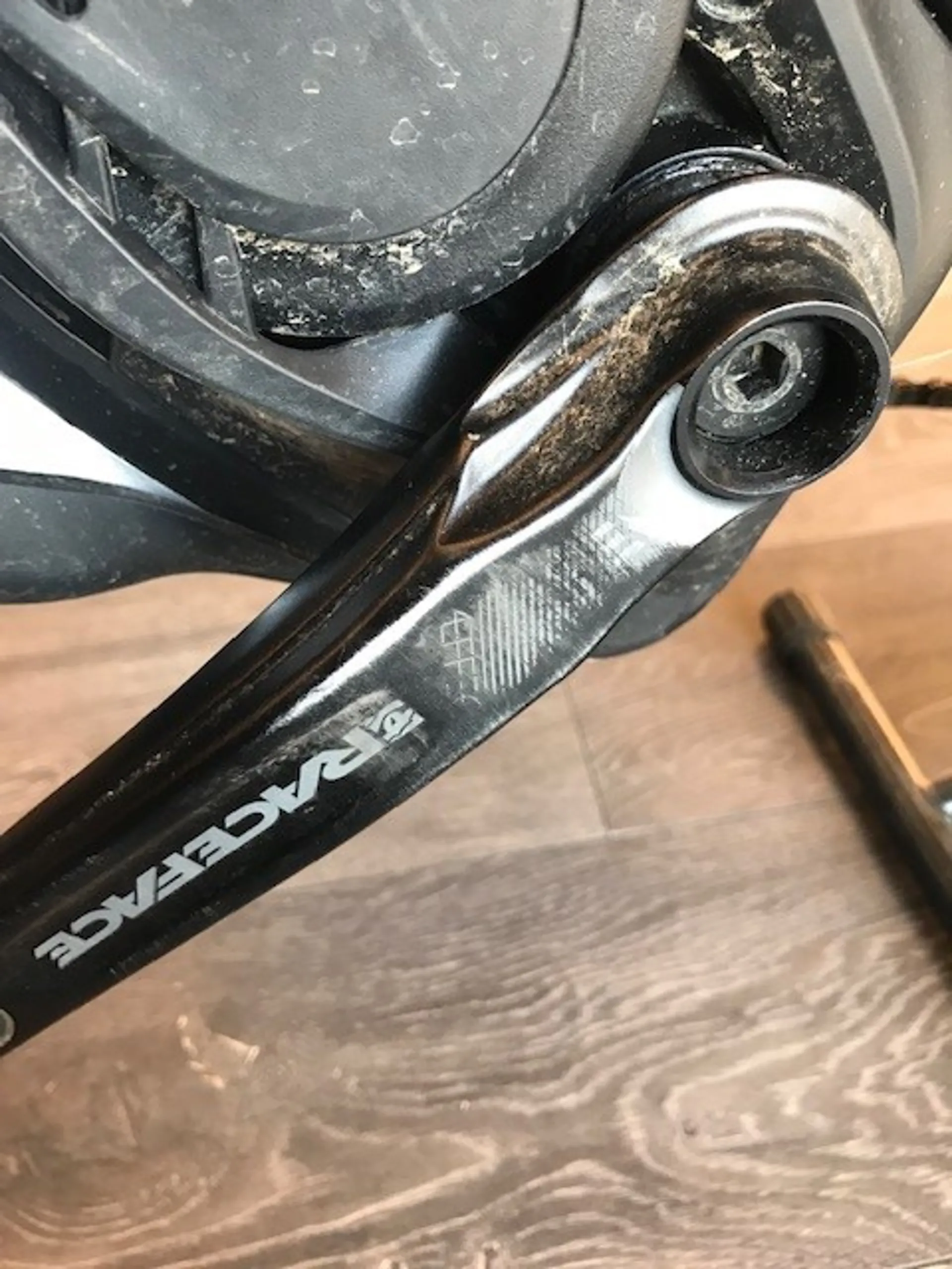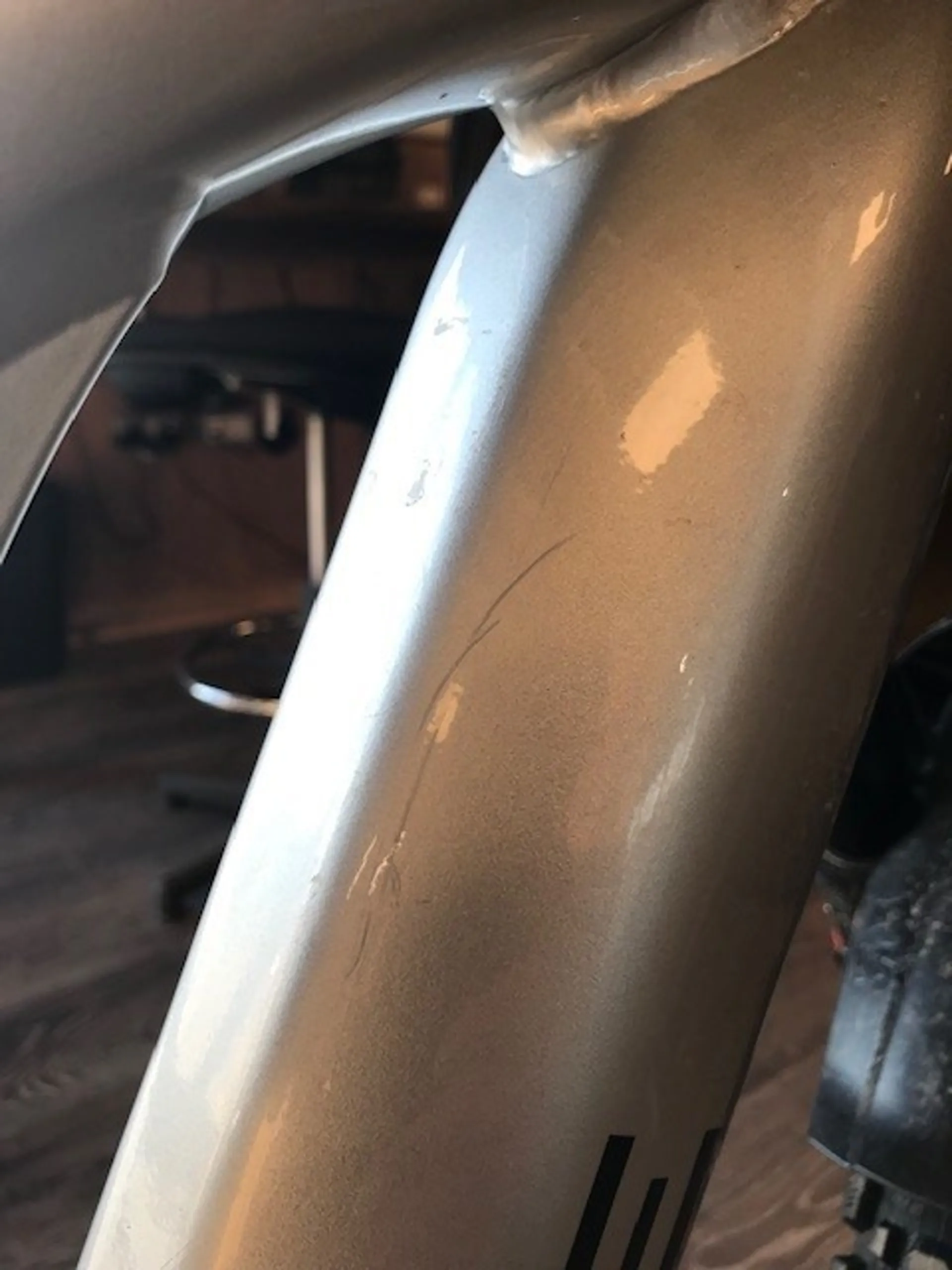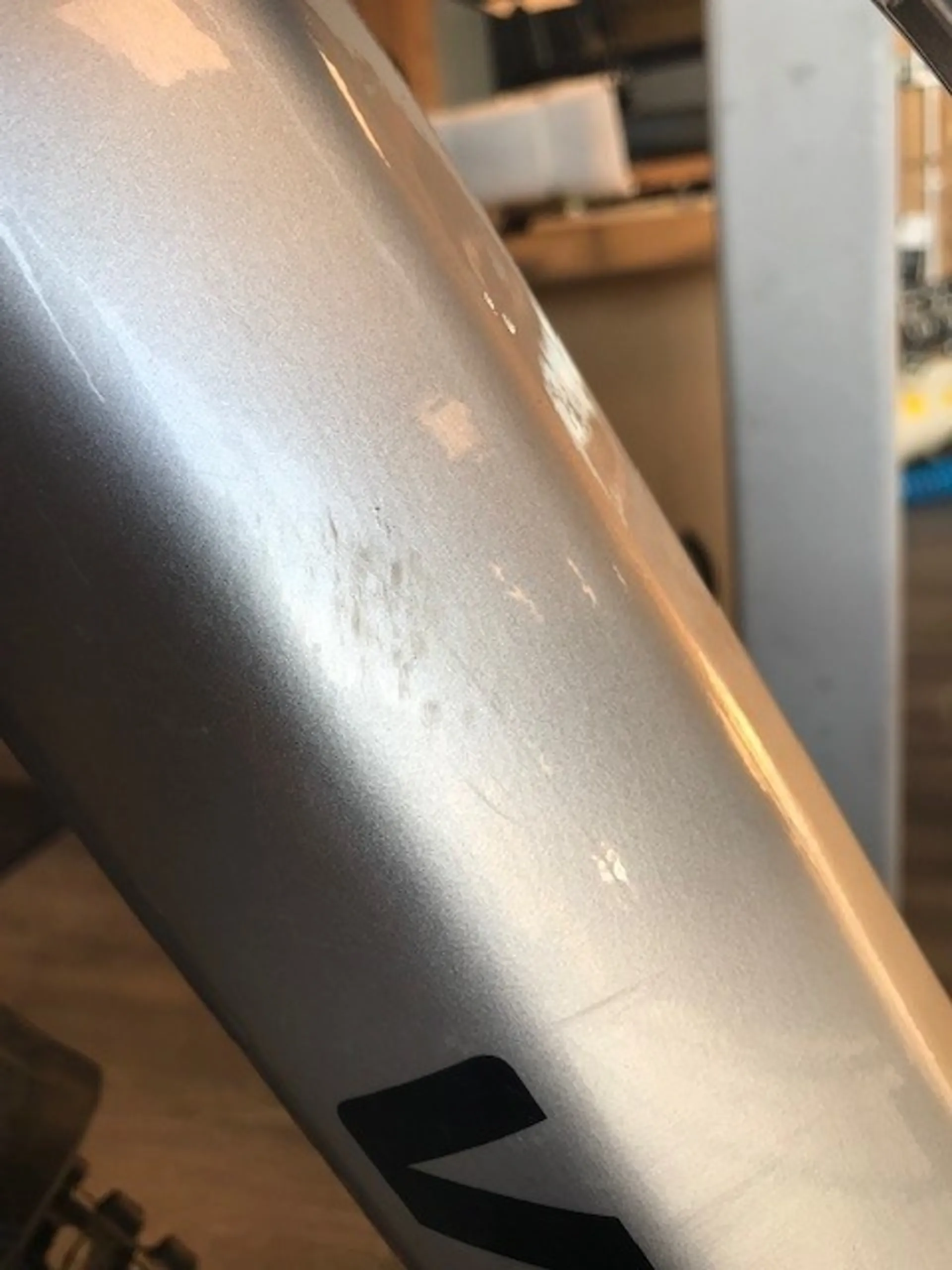 Damage Details: Ex Demo, the gloss silver finish has many area's of scuffing in the lacquer. Usual cosmetic damage to anodising on Raceface cranks and damage to fork decals.