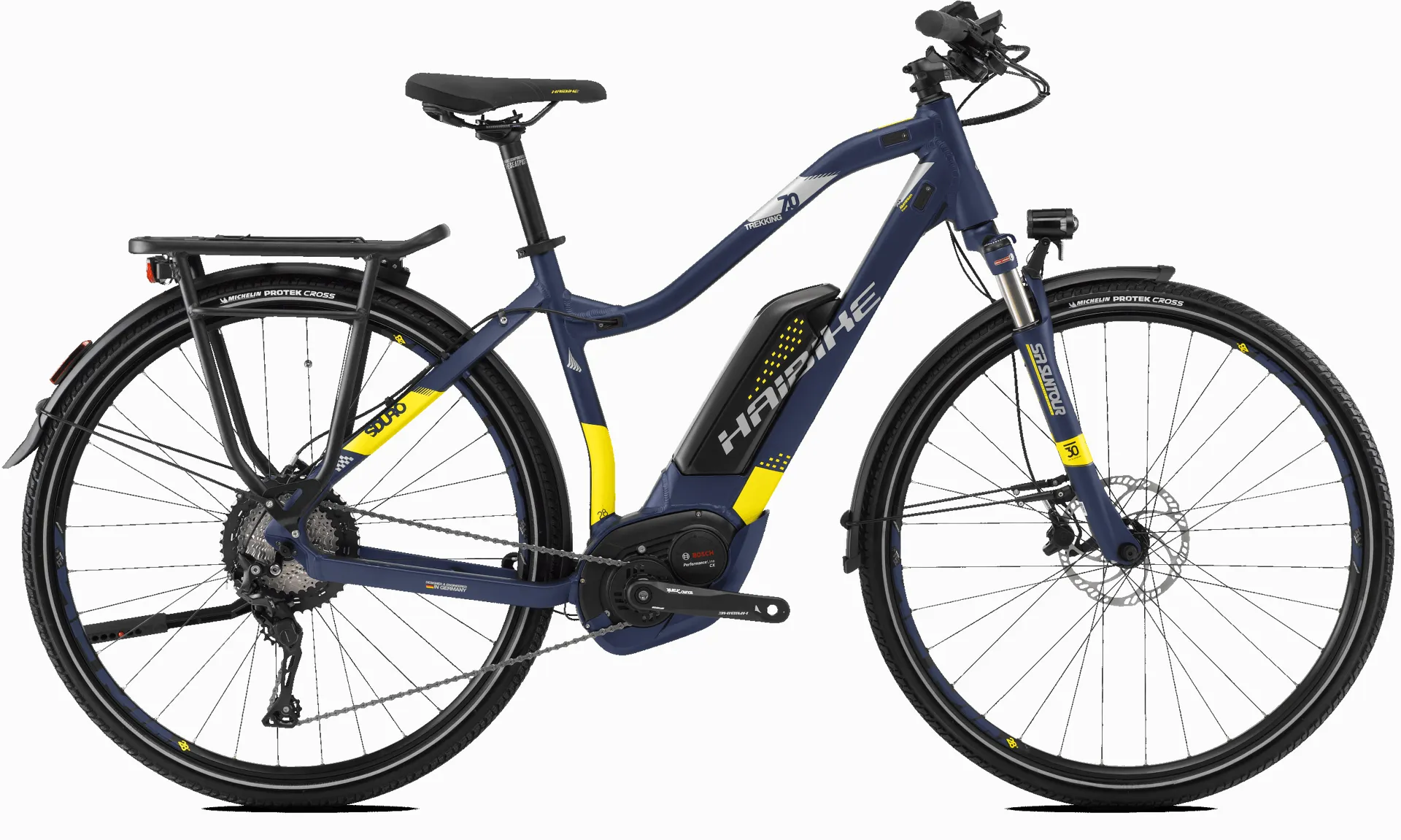 The Haibike SDURO Trekking 7.0 comes with a relaxed geometry to let you ride comfortably and safety for long distances. Spec'd as standard with mudguards,  side stand, powerful lights, and pannier holders, this bikes come equipped and ready for adventure.