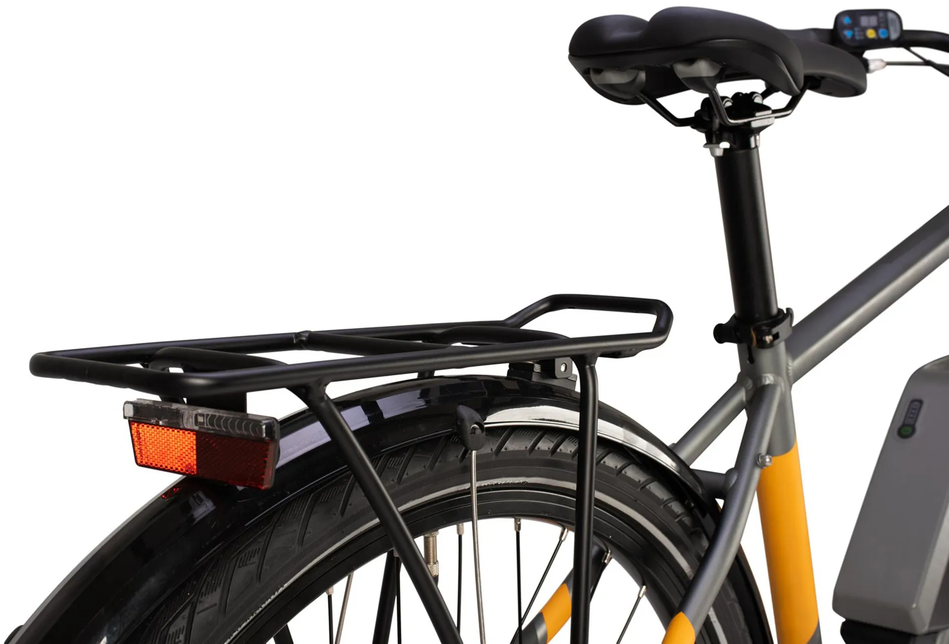 The Suntour E25 rear wheel motor is coupled with 7 speed Shimano derailleur gears featuring the easy to use twist shift dial and provide a wide range of gears to choose from. The new and more powerful 400wh battery will take you up to up to 100km on a single charge depending on the level of assistance selected and can be easily removed so you can take it into the house to charge it for your next ride. This Array comes fully equipped with a kickstand, comfortable saddle, steel mudguards, front and rear lights and a rear pannier rack so you can ride all year round, day or night with your fully loaded pannier bags if you wish.