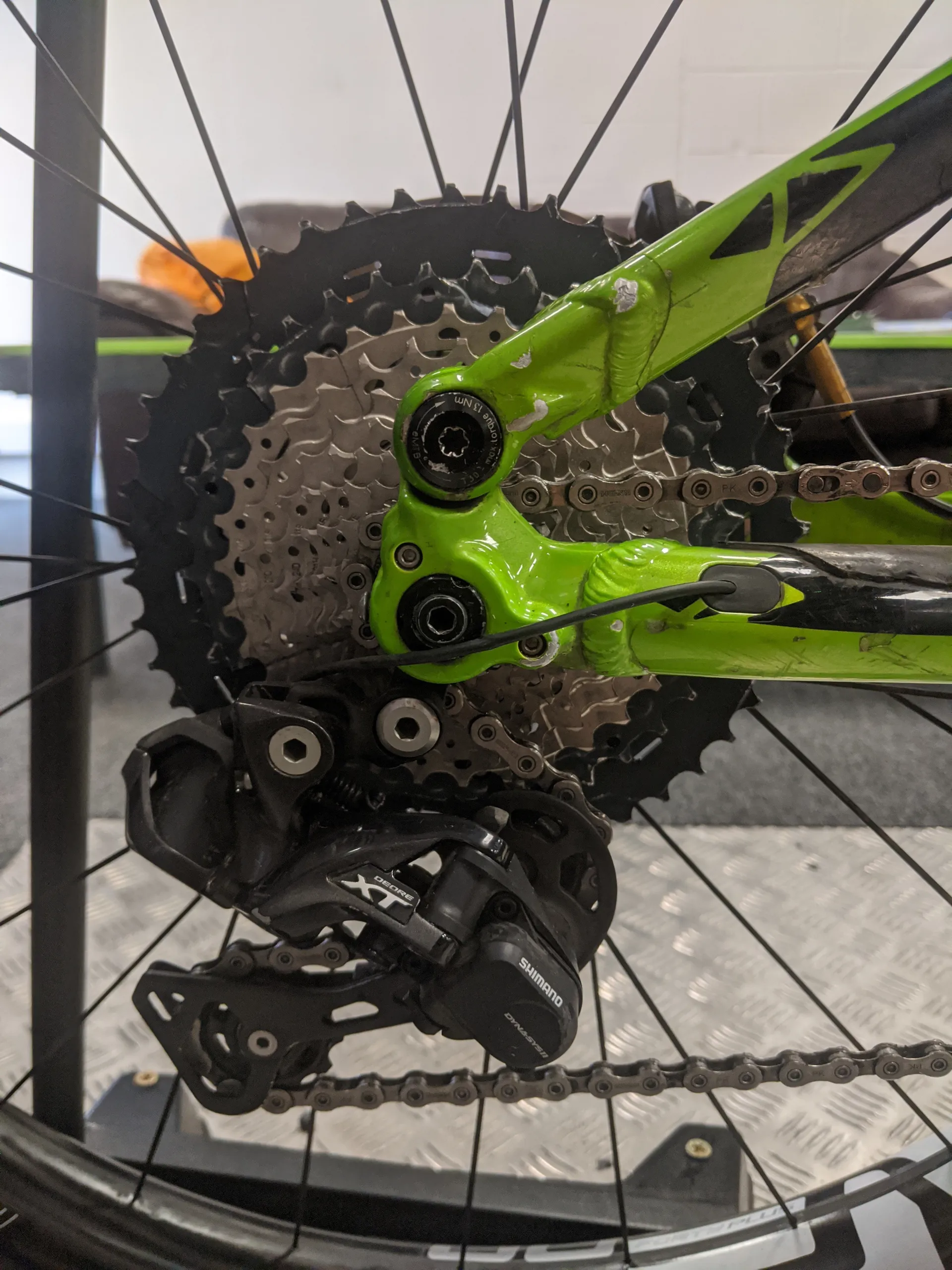 General wear and tear, lots of scratches on and under the wrap on the rear stays slight scratch on the fork sanctions