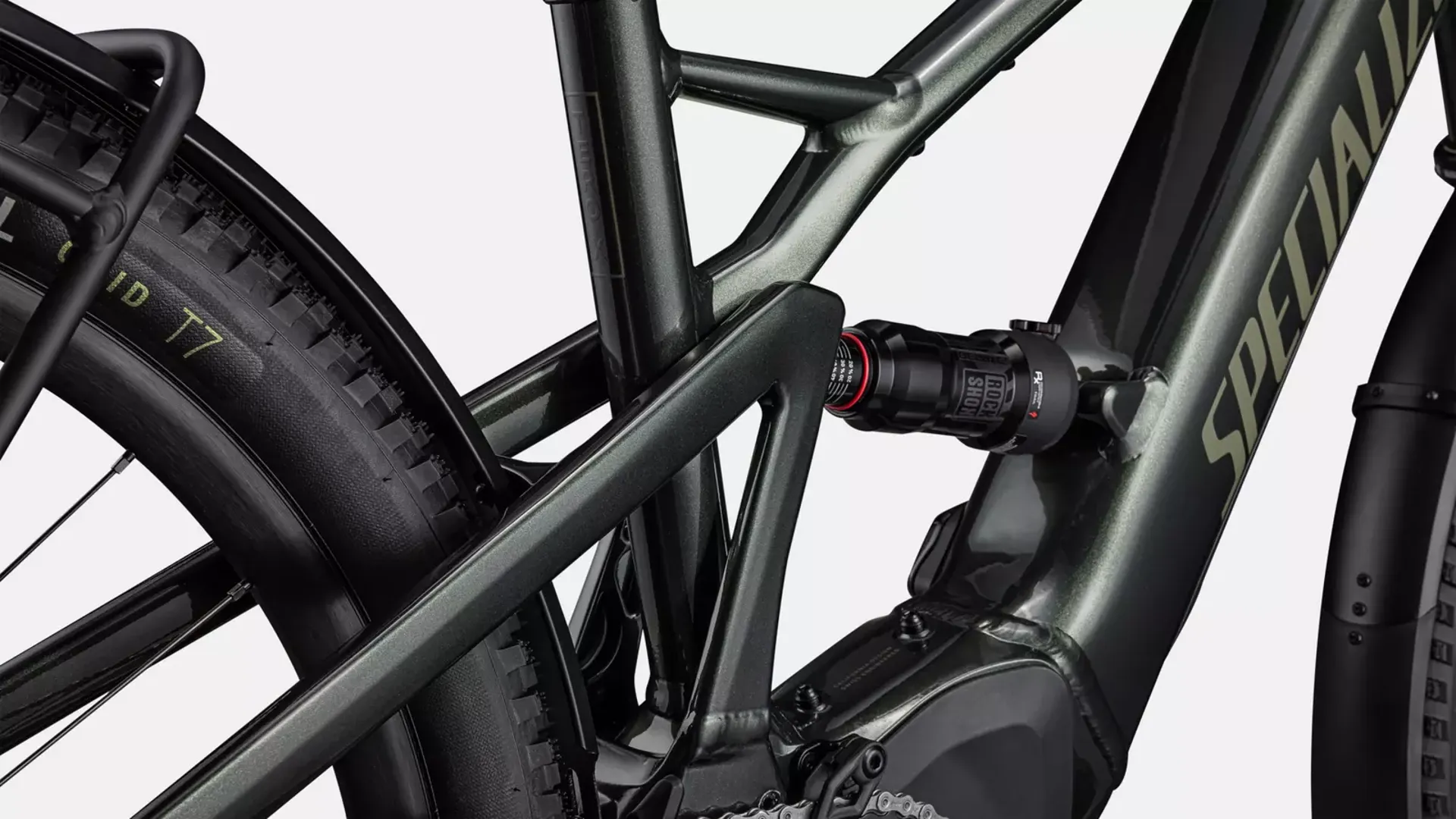 Frame: E5 Aluminum, full suspension, mullet style for M-XL, bottom bracket motor mount, fully integrated & lockable downtube battery, internal cable routing, lock and front rack mount
