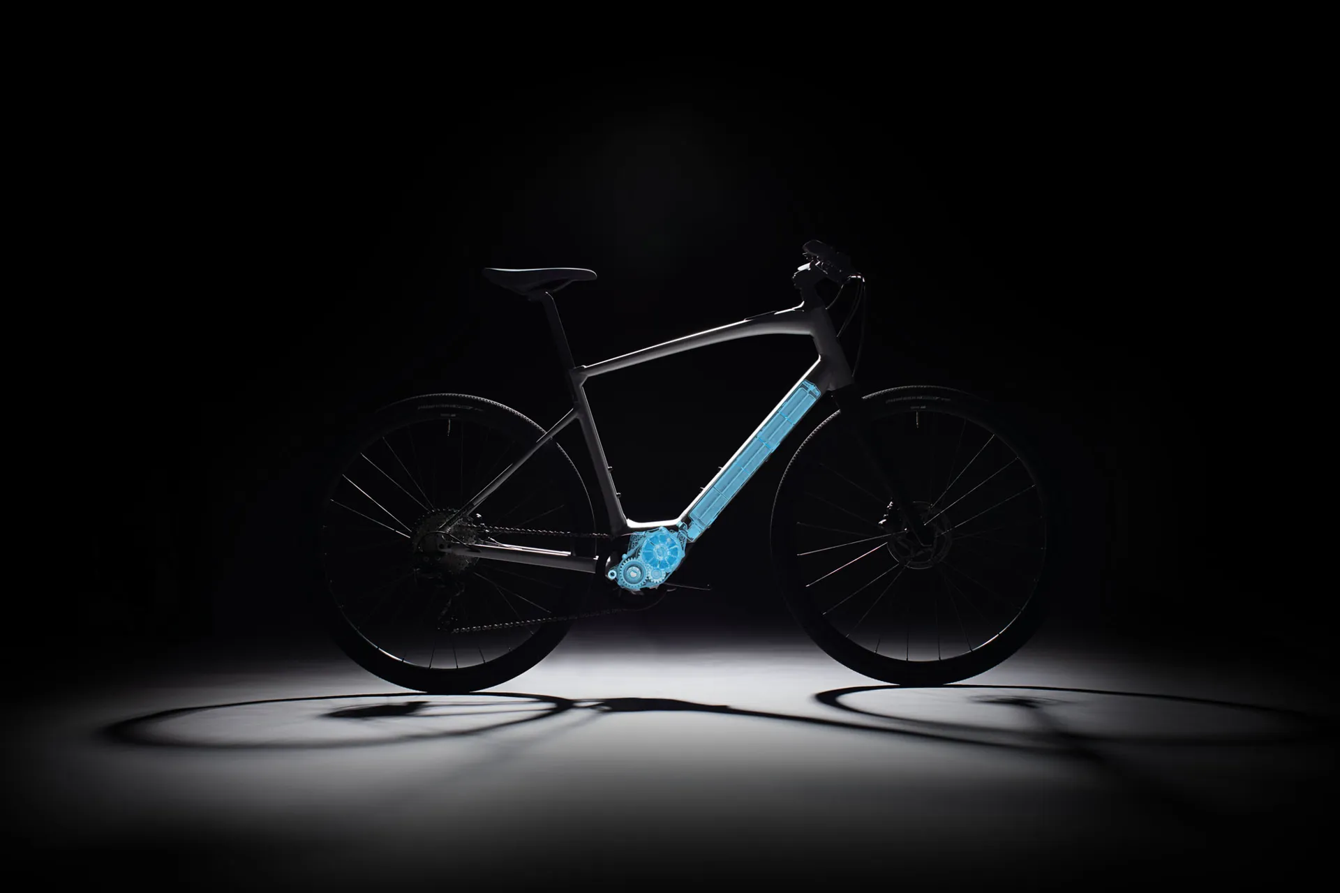 E5 Aluminum, Fitness/Transportation Geometry, bottom bracket motor mount, fully integrated down tube battery, internal cable routing, fender/rack mounts, Smooth Welds, reflective graphics