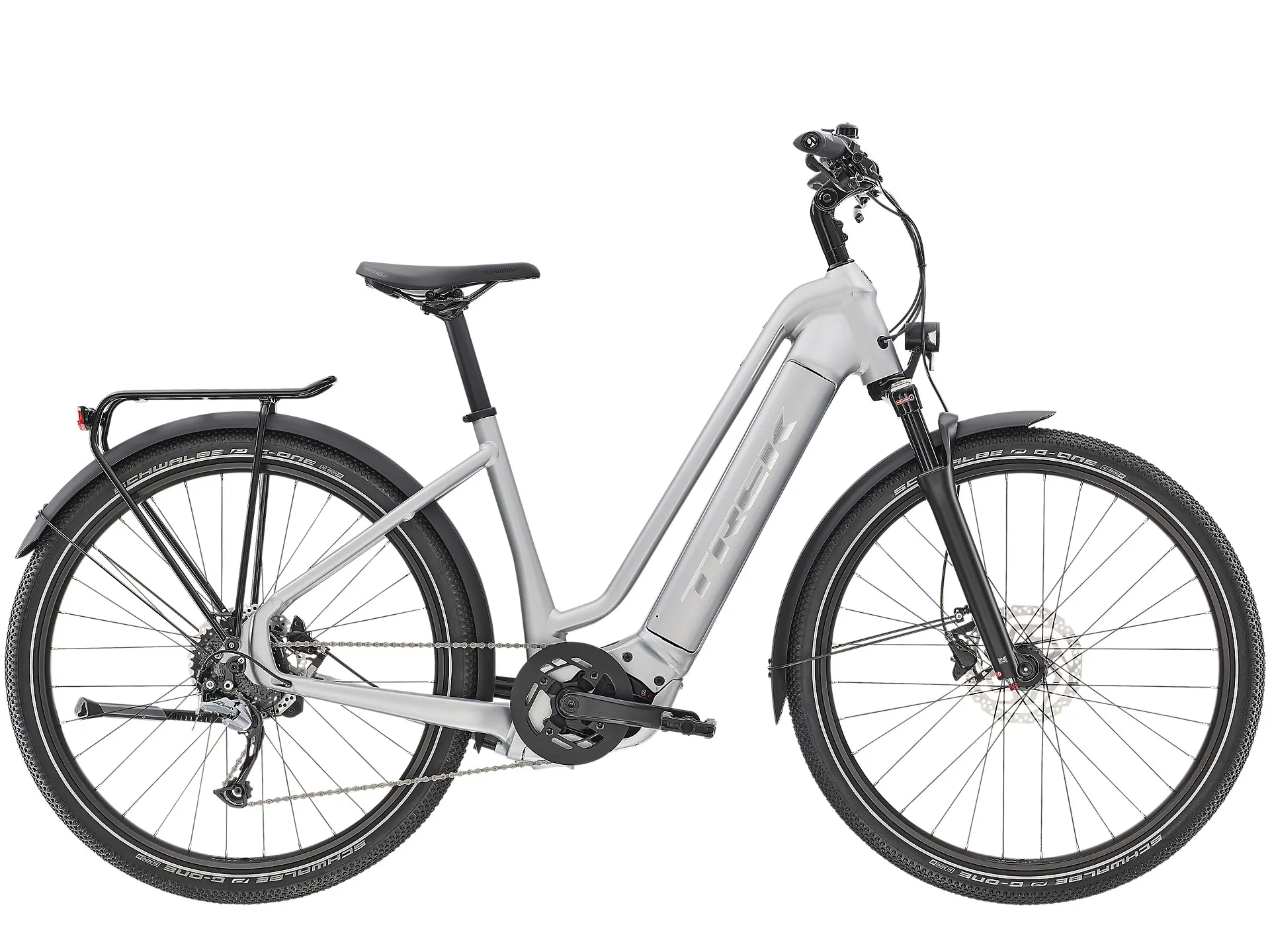 A sleek, high-performance hydroformed aluminium frame with a lowstep design that makes it easier to hop on and off, a fully-integrated 500 Wh Bosch PowerTube battery, a powerful Bosch Performance Line CX (250 W, 75 Nm) drive unit that helps you sustain speeds of up to 20 mph (25 km/h in Europe) and a Purion controller. Plus, an SR Suntour suspension fork with a lockout feature, a 9-speed Shimano drive train, hydraulic disc brakes for all-weather stopping power, an integrated front and rear lighting system, mudguards, a rear rack and stiff 27.5" wheels with thru axles.
