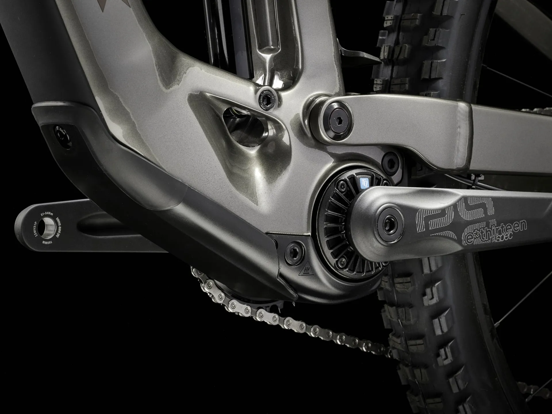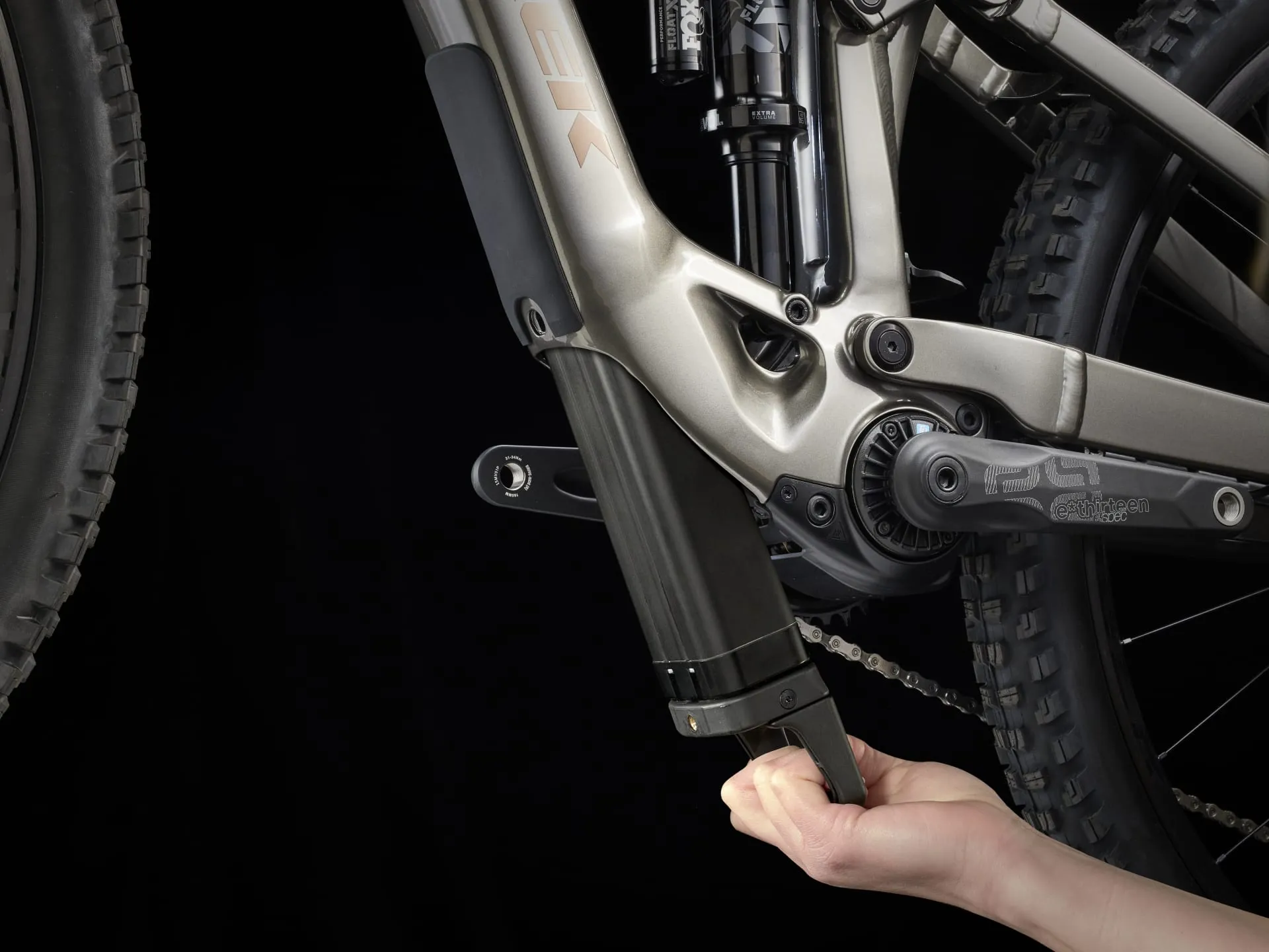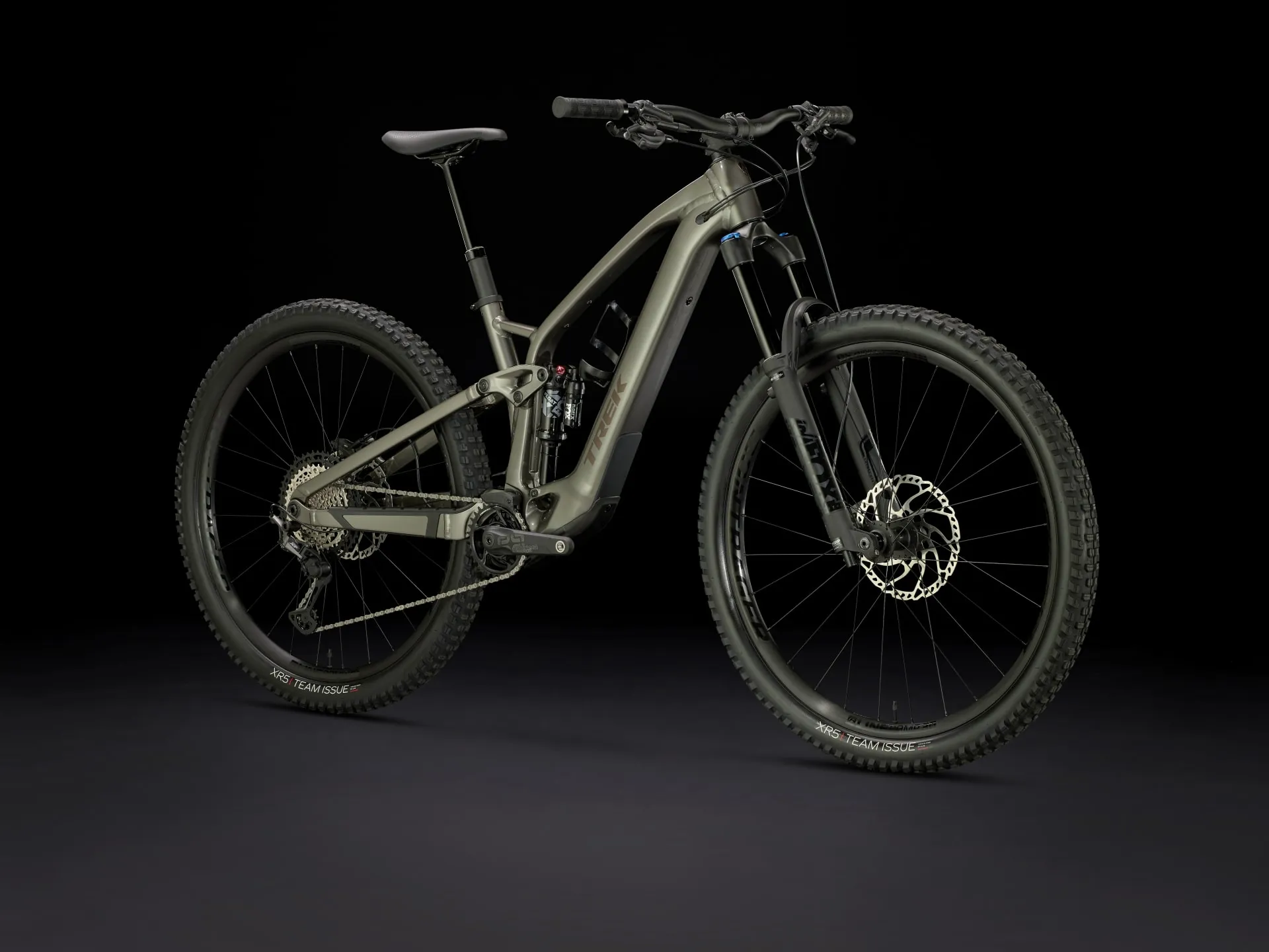 An Alpha Platinum Aluminium frame with TQ's HPR50 harmonic pin ring drive system, a fully-encased 360 Wh removable battery and smart charging port. An integrated LED display and handlebar remote that are easy to use on the fly. 150 mm FOX Rhythm 36 front suspension with Float EVOL air spring and GRIP damper and 140 mm FOX Performance Float X rear suspension. Plus, wide, Tubeless Ready Bontrager Line Comp 30 wheels, a 12-speed Shimano XT drivetrain, hydraulic disc brakes and a dropper post.