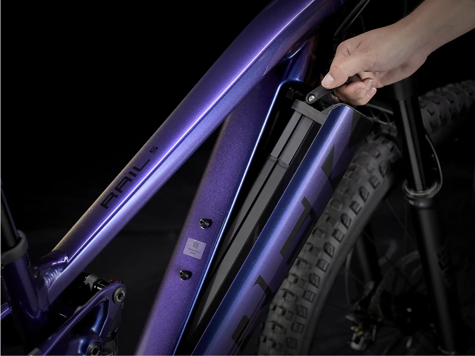 Trek's Removable Integrated Battery (RIB) system looks great and is super user-friendly: it fully hides the battery in the frame for protection, makes it easy remove the battery without tools and lets you mount a water bottle cage
