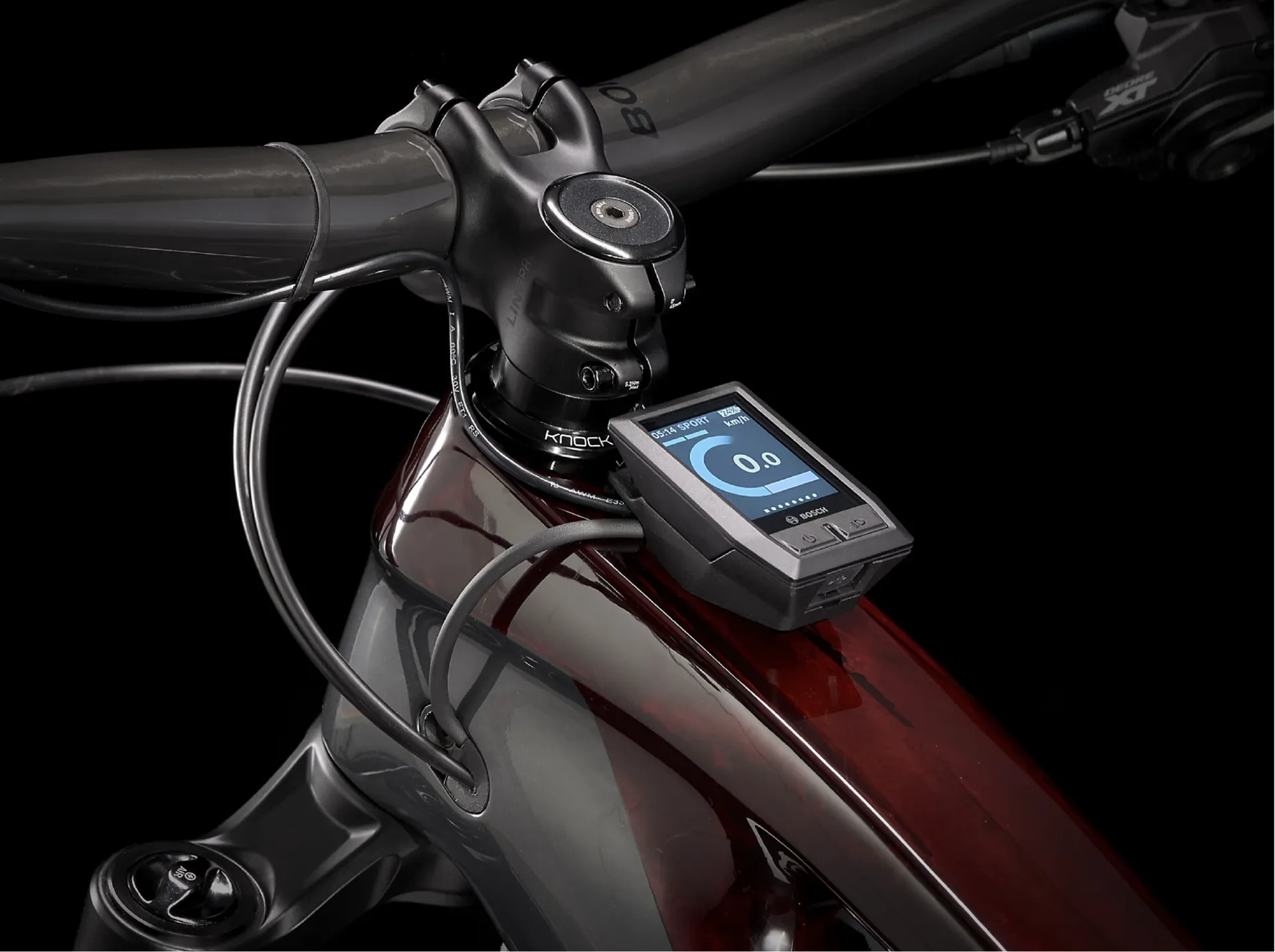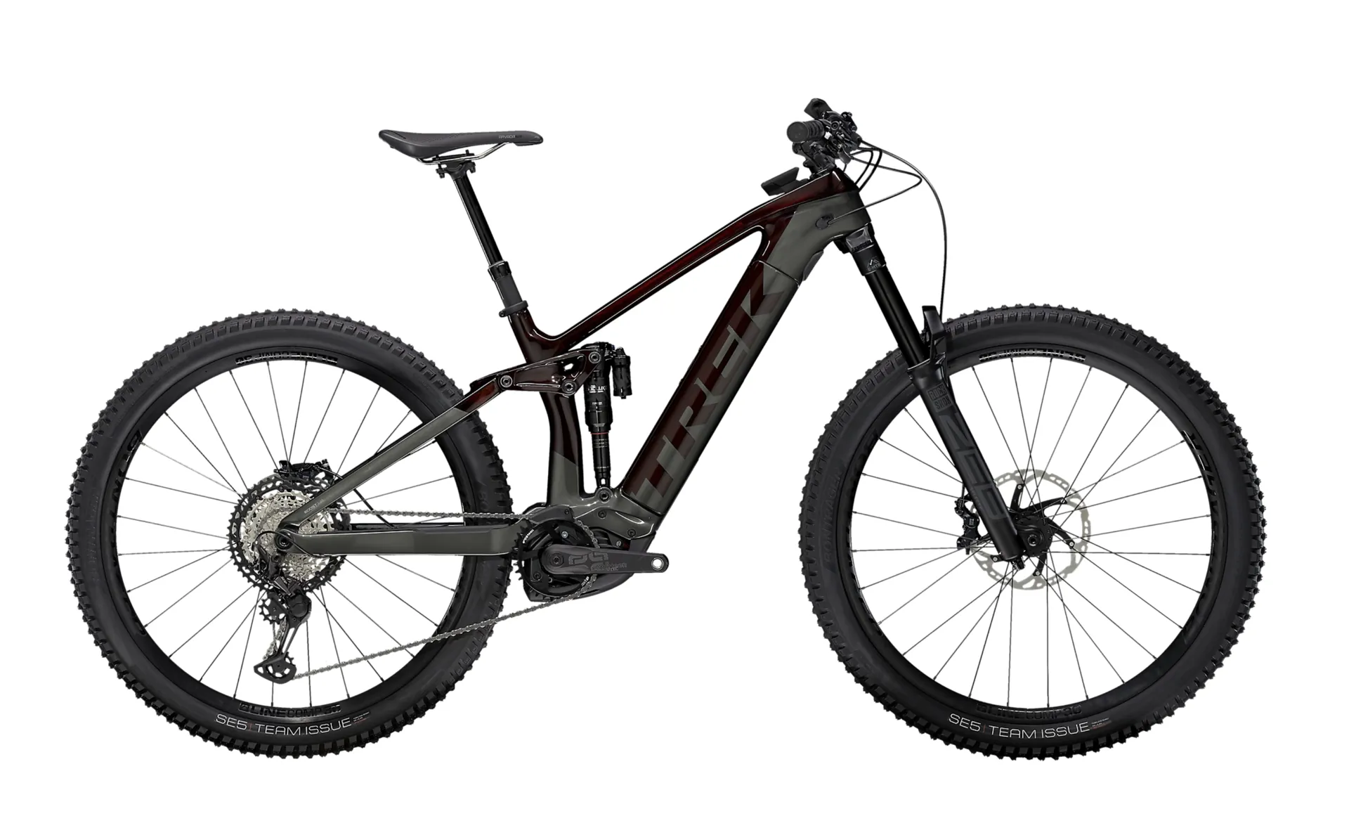 A light and durable OCLV Mountain Carbon main frame with carbon stays that fully encases a 625 Wh battery for sleek looks and protection on the trail, a 160 mm RockShox Lyrik Select Plus fork with Charger 2 RC damper, 150 mm of rear travel with a RockShox Deluxe RT3 shock with Trek's RE:aktiv with Thru Shaft damper, a powerful new Bosch Performance Line CX 250 W motor that assists up to 25 km/h and a Purion controller. A 1x12 Shimano XT drivetrain, Bontrager Line Elite dropper post, 4-piston brakes, a carbon handlebar and Bontrager Line Comp 30 29er wheels with Bontrager SE5 Team Issue tyres.