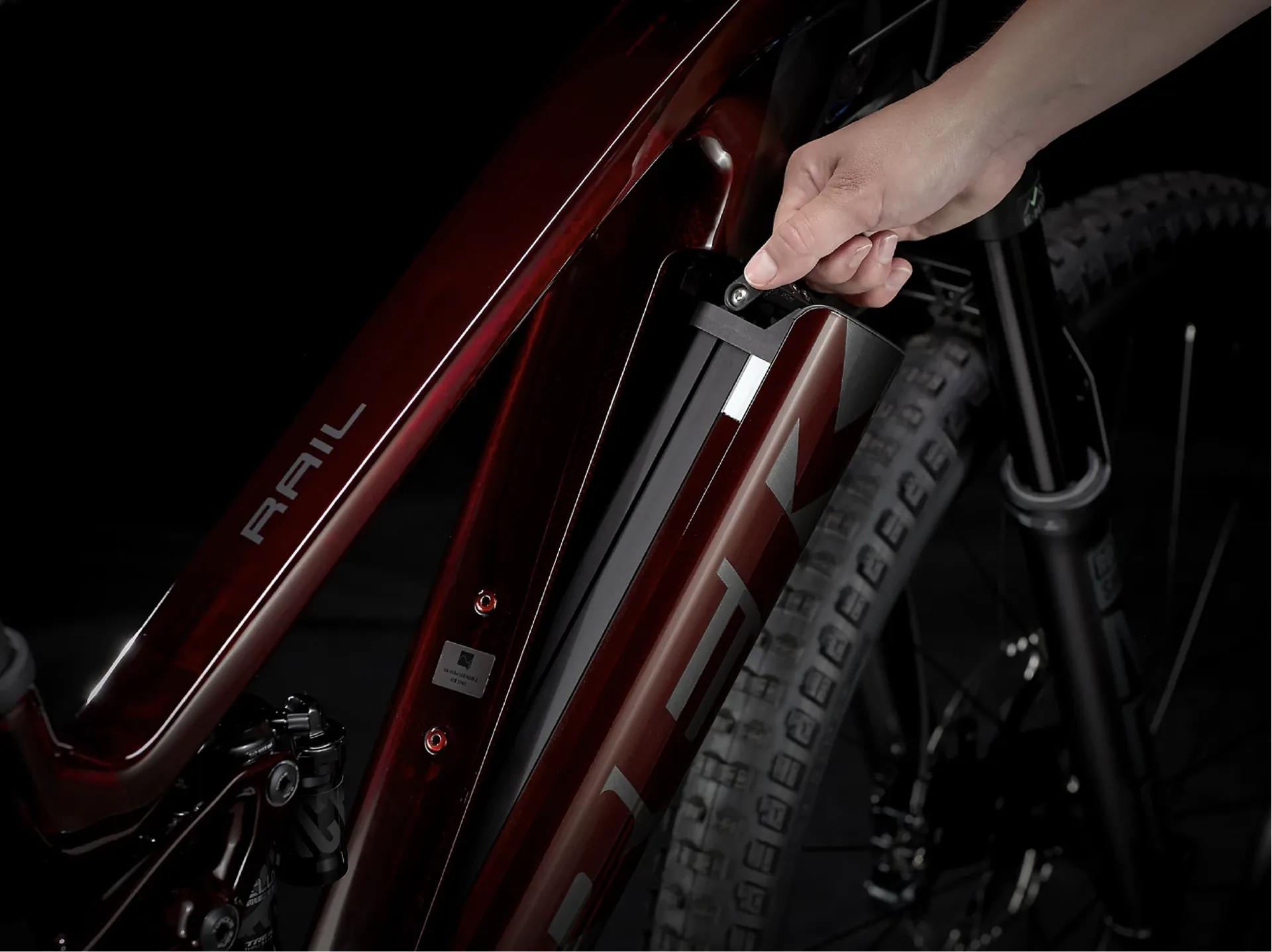 Trek's Removable Integrated Battery (RIB) system looks great and is super user-friendly: it fully hides the battery in the frame for protection, makes it easy remove the battery without tools and lets you mount a water bottle cage