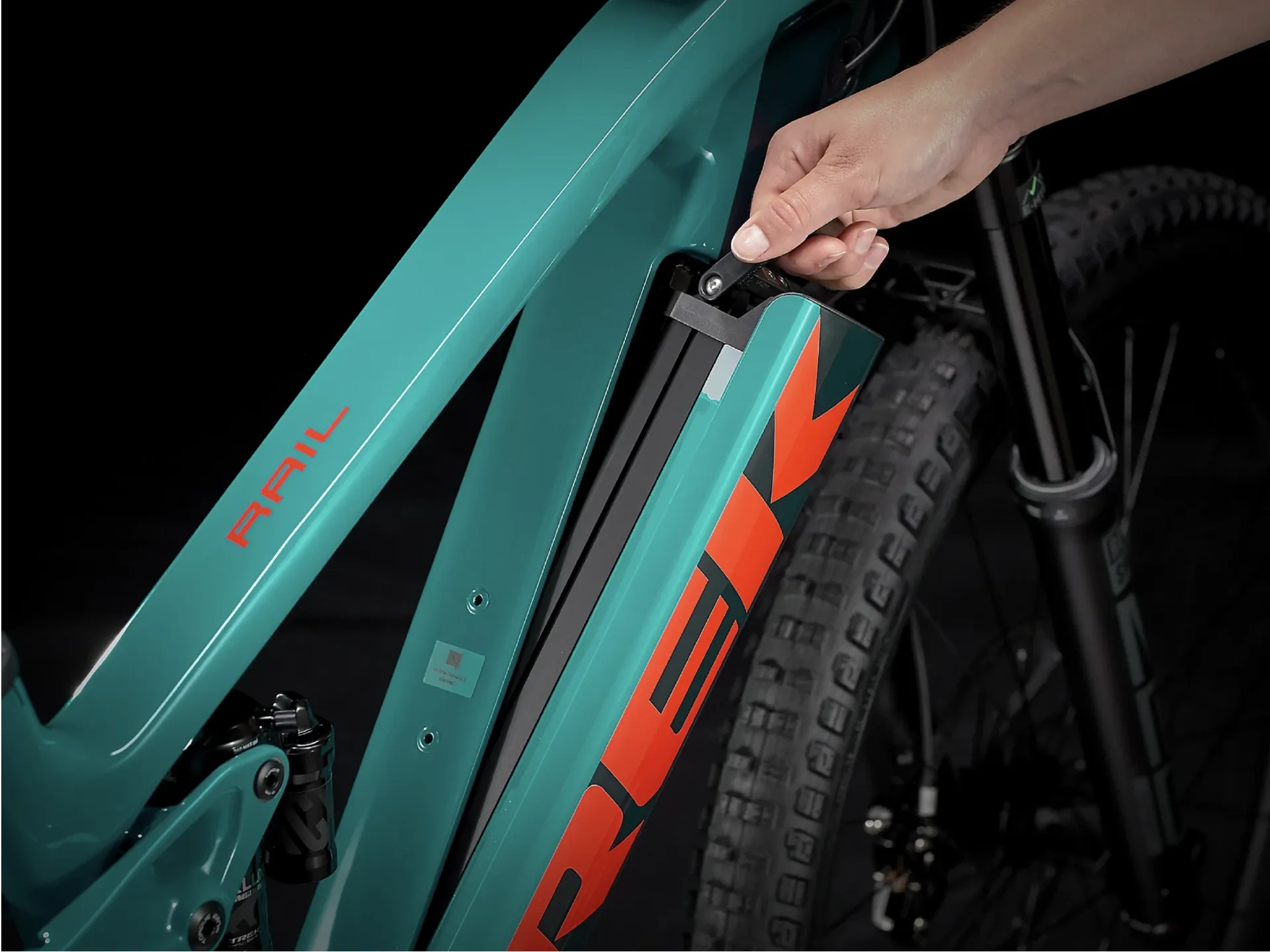 Trek's Removable Integrated Battery (RIB) system looks great and is super user-friendly: it fully hides the battery in the frame for protection, makes it easy remove the battery without tools and lets you mount a water bottle cage