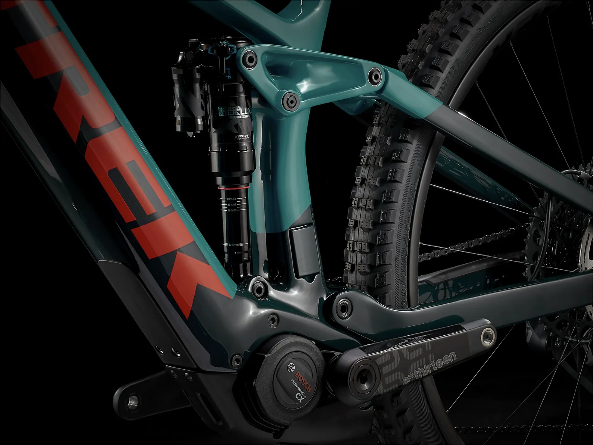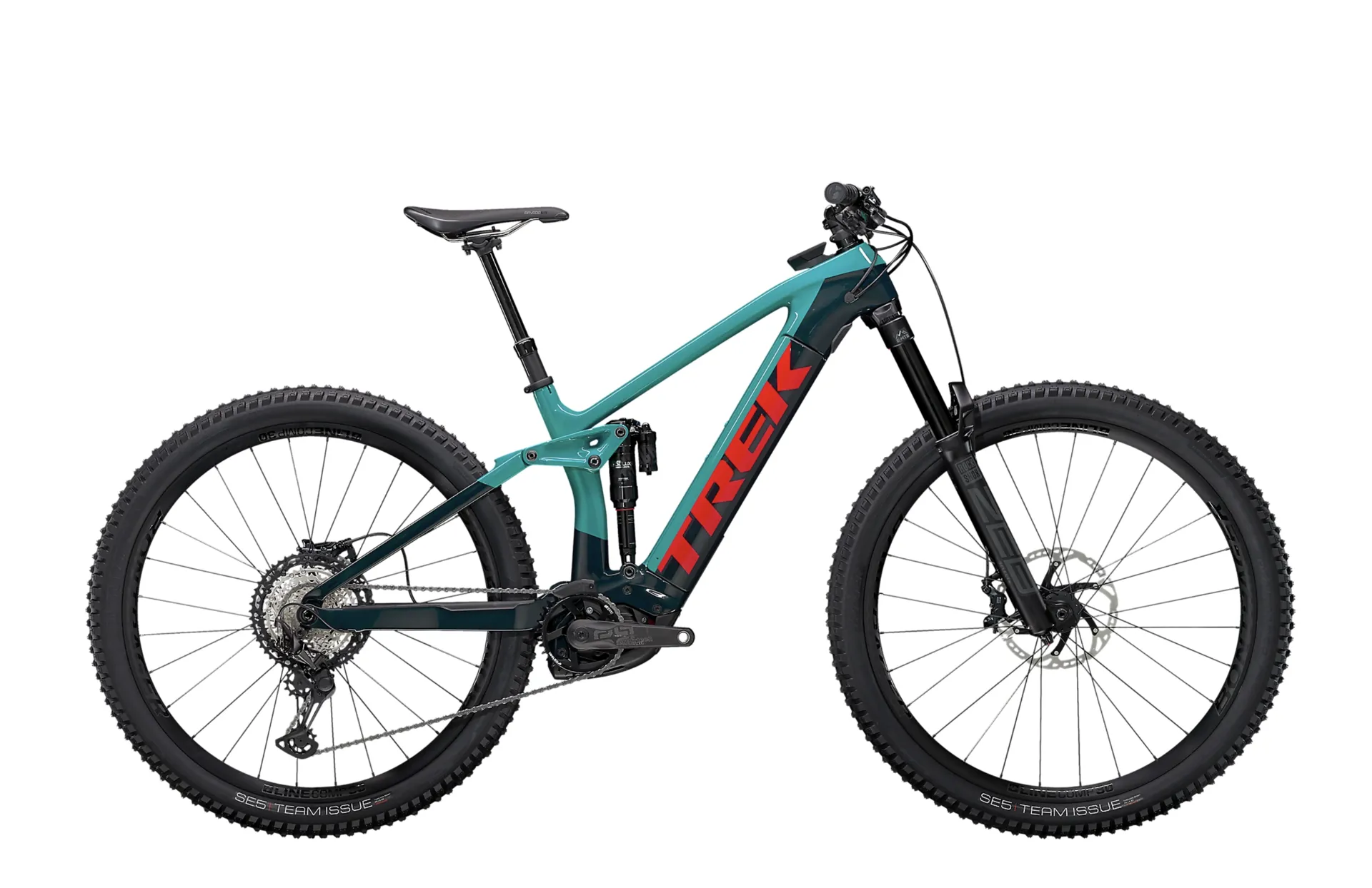 A light and durable OCLV Mountain Carbon main frame with carbon stays that fully encases a 625 Wh battery for sleek looks and protection on the trail, a 160 mm RockShox Lyrik Select Plus fork with Charger 2 RC damper, 150 mm of rear travel with a RockShox Deluxe RT3 shock with Trek's RE:aktiv with Thru Shaft damper, a powerful new Bosch Performance Line CX 250 W motor that assists up to 25 km/h and a Purion controller. A 1x12 Shimano XT drivetrain, Bontrager Line Elite dropper post, 4-piston brakes, a carbon handlebar and Bontrager Line Comp 30 29er wheels with Bontrager SE5 Team Issue tyres.