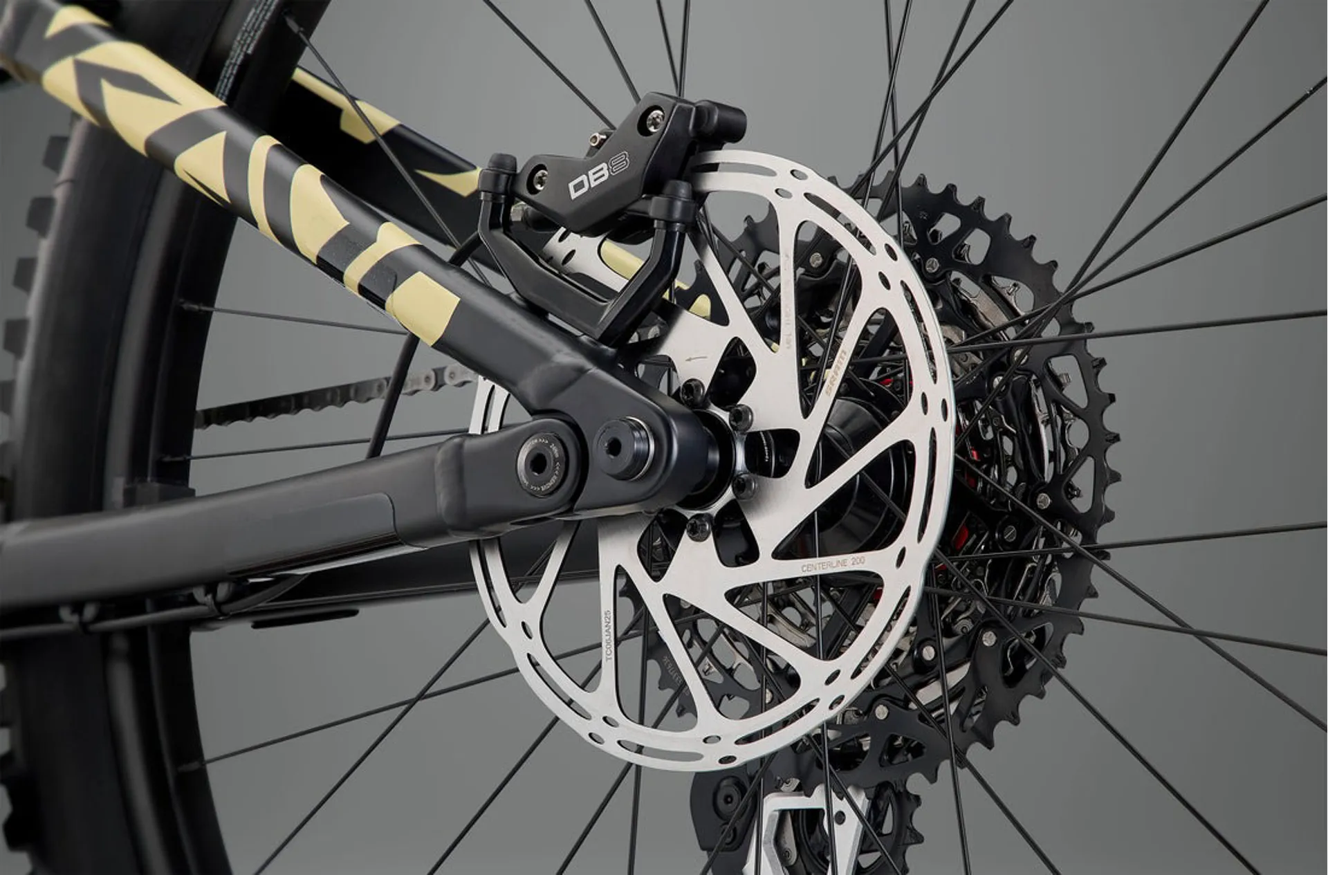 SRAM DB8 Stealth, four piston with sintered metal pads, 200mm six bolt Centreline rotors