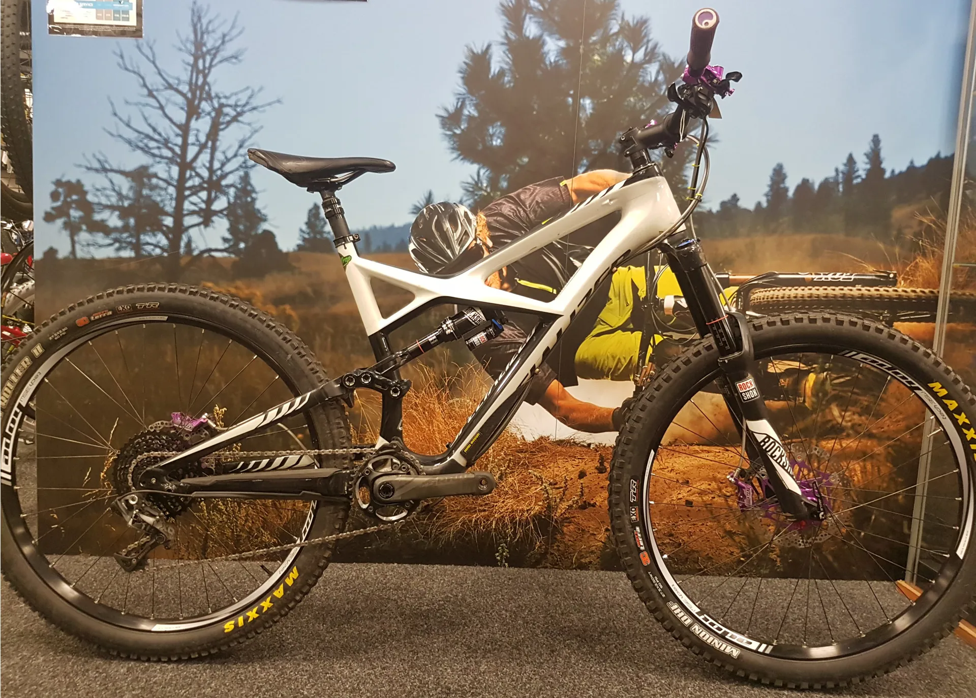 And to further ensure top-level performance on the way down, this geo is mated with 160mm of plush travel up front & 165mm at rear. Handling suspension duties out back is the revolutionary, air-sprung Ohlins single tube rear shock. And for the build, the Enduro spares no expense at hitting the pinnacle of performance, with a mix of SRAM for shift and drivetrain duties, powerful Guide RS brakes, and the venerable RockShox Pike RC 650b fork. Complete with Hope 35W Enduro hoops & purple Pro 4 hubs. There's nothing that this bike isn't ready for.