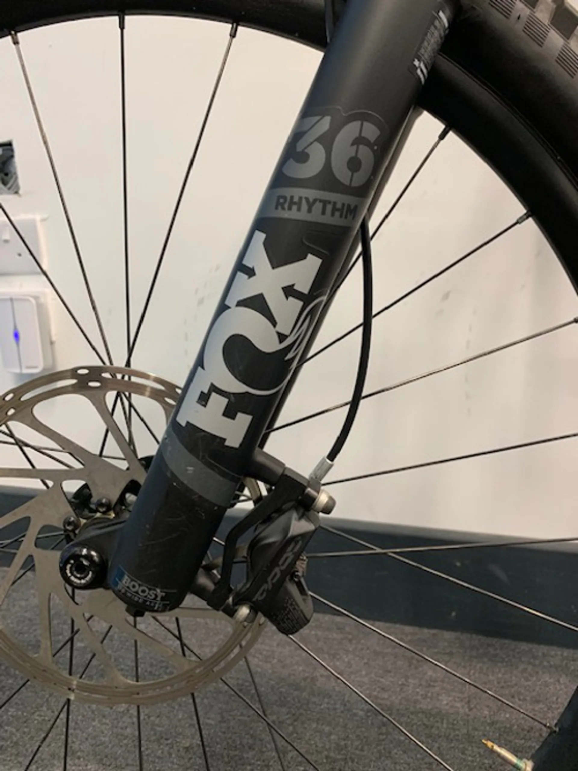 • A Fox rhythm 36 fork handles suspension duties up front with stiff stanchions, plenty of adjustability, and 160mm of travel.