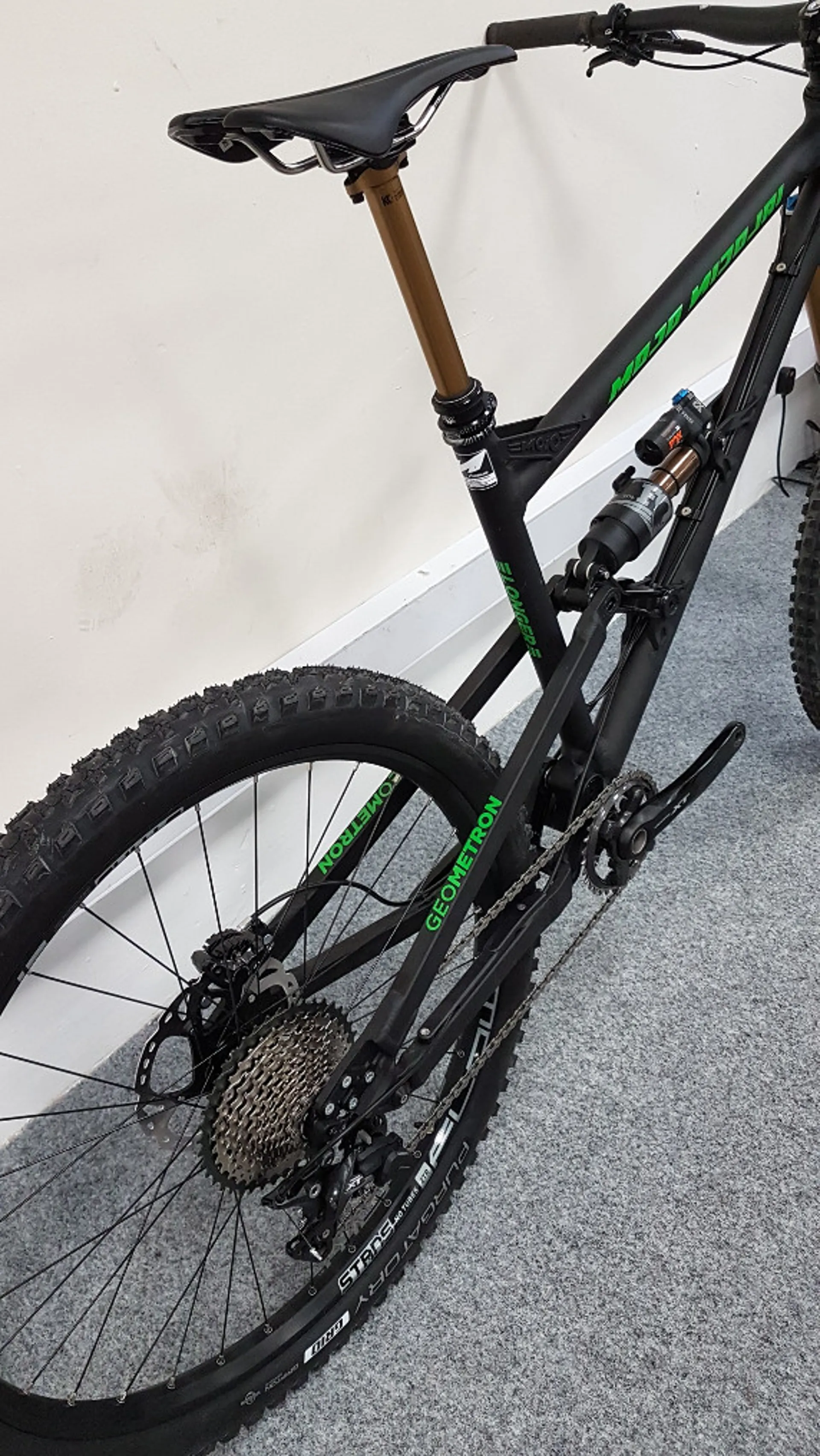 With a four bar linkage pivot system the suspension of the Mojo Geometron delivers the perfect anti-squat ratios and progression, working in tandeom with the Fox 36 fork up front to create a raised front end for an even slacker head angle. The suspension has also taken into consideration the chainring size, tailoring the anti-squat for flawless gear shifting on technical climbs.