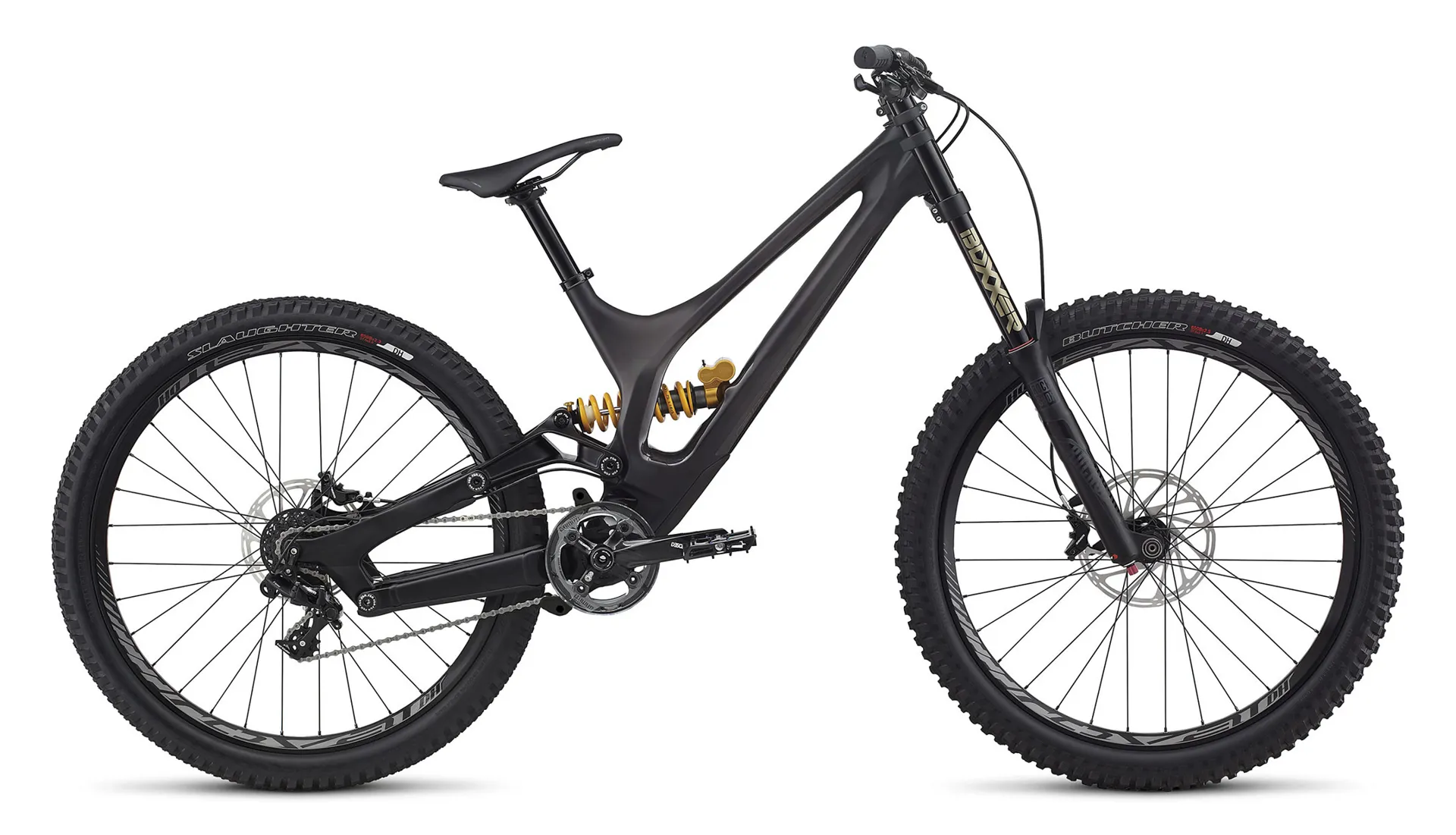 For the suspension, the Specialized Demo 8 Carbon features 200mm up front via a RockShox BoXXer RC 650b fork and 200mm of travel at the rear controlled by the revolutionary Öhlins rear shock. Together, the combo ensures that you'll be able to rocket over any terrain with confidence. And when you add in a build kit consisting of SRAM's powerful Guide R brakes, a durable one-by SRAM drivetrain, and legendary Specialized Butcher & Slaughter DH tyres, you start get the picture of why the Demo 8s have won so many races.