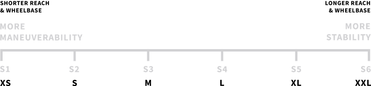 Determining your size is easy, each of the sizes from S1 to S6 correlates to a previous size. For example, if you rode a Medium before, then S-3 will be your equivalent size. But... if you want a quicker, more nimble ride, you’d drop down to an S2. Want a bike that’s more stable at speed or in the gnar? Bump up to an S4.