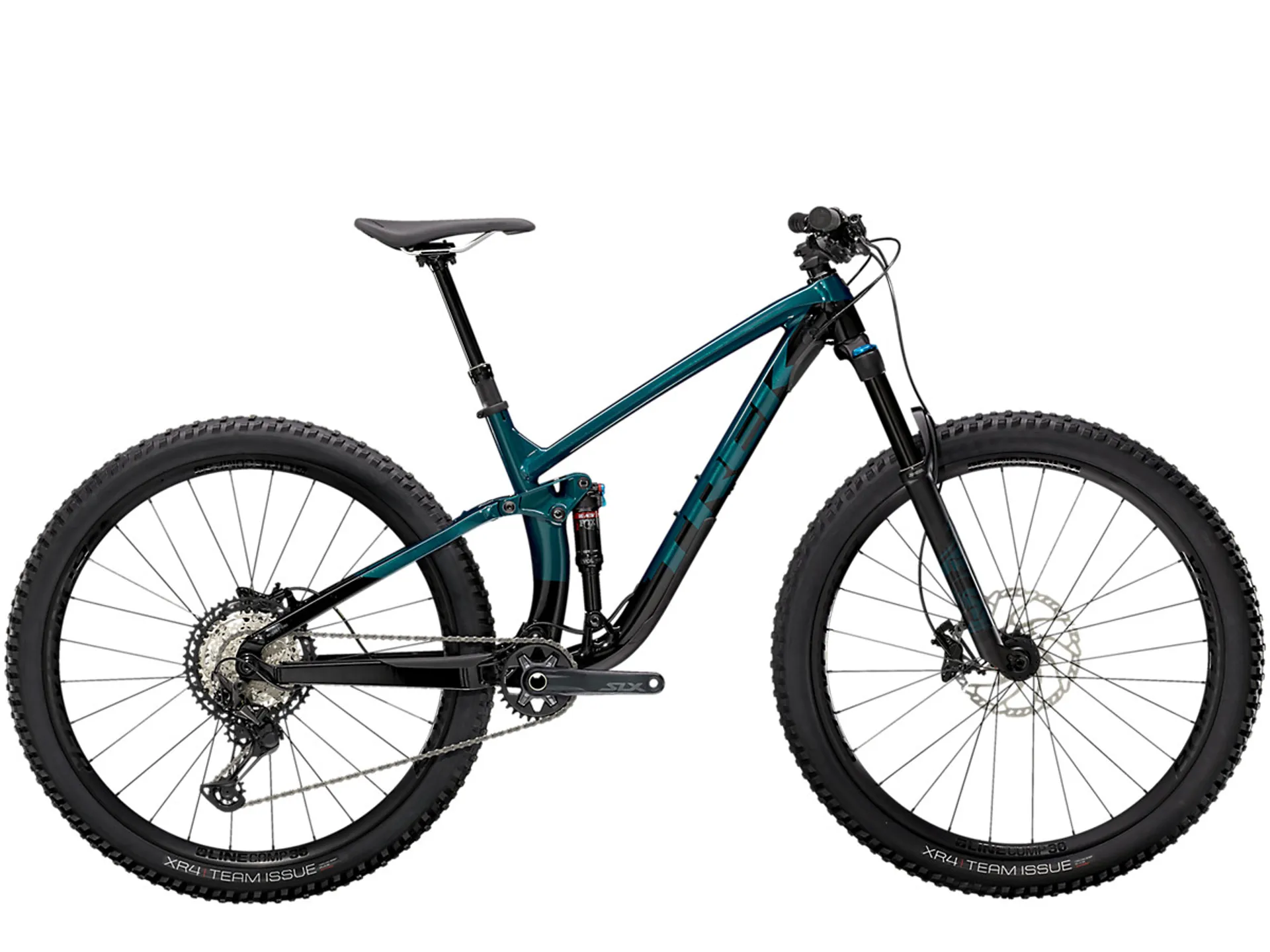 An alloy frame, 140 mm FOX Rhythm 34 fork and 130 mm of rear travel with an extra-efficient RE:aktiv damper. A Shimano XT 1x12 drive train with an extra-low 51-tooth climbing gear, plus a Bontrager Line dropper post.