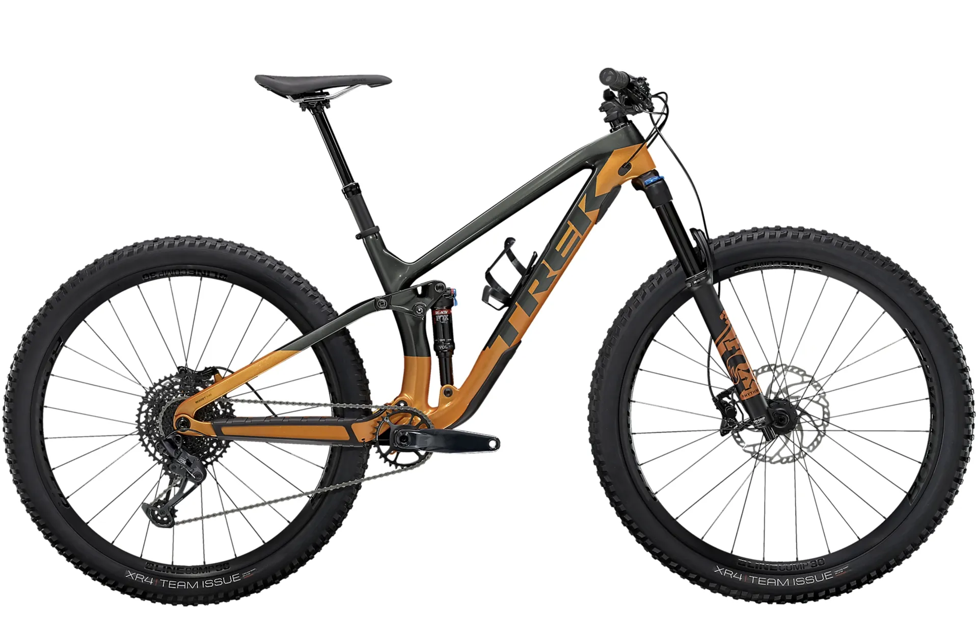 A lightweight and stiff full OCLV Mountain Carbon frame with internal storage, a 140 mm FOX Rhythm 36 fork, 130 mm of rear travel with a FOX Float Performance rear shock with Trek's efficient RE:aktiv damper, a wide-range 1x12 SRAM NX/GX Eagle drive train, a Bontrager Line dropper post and powerful Shimano 4-piston hydraulic disc brakes.