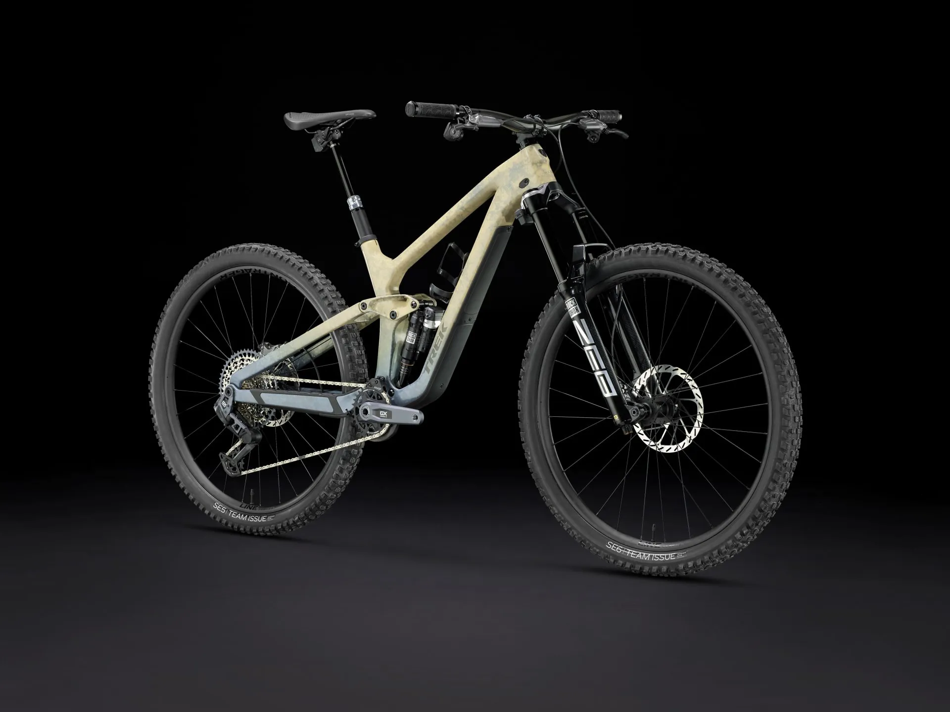 An OCLV Mountain Carbon frame with a one-of-a-kind Project One Earth and Air paint scheme. Upgraded 160 mm RockShox Super Deluxe Ultimate Flight Attendant shock and 170 mm RockShox ZEB Ultimate fork with Flight Attendant, Debon Air spring and Charger 2.1 RCT3 AXS damper. Tubeless-Ready Bontrager Line Comp 29˝ wheels, a wireless SRAM GX AXS transmission, RockShox Reverb AXS dropper post, carbon bars and SRAM CODE Bronze 4-piston hydraulic brakes.
