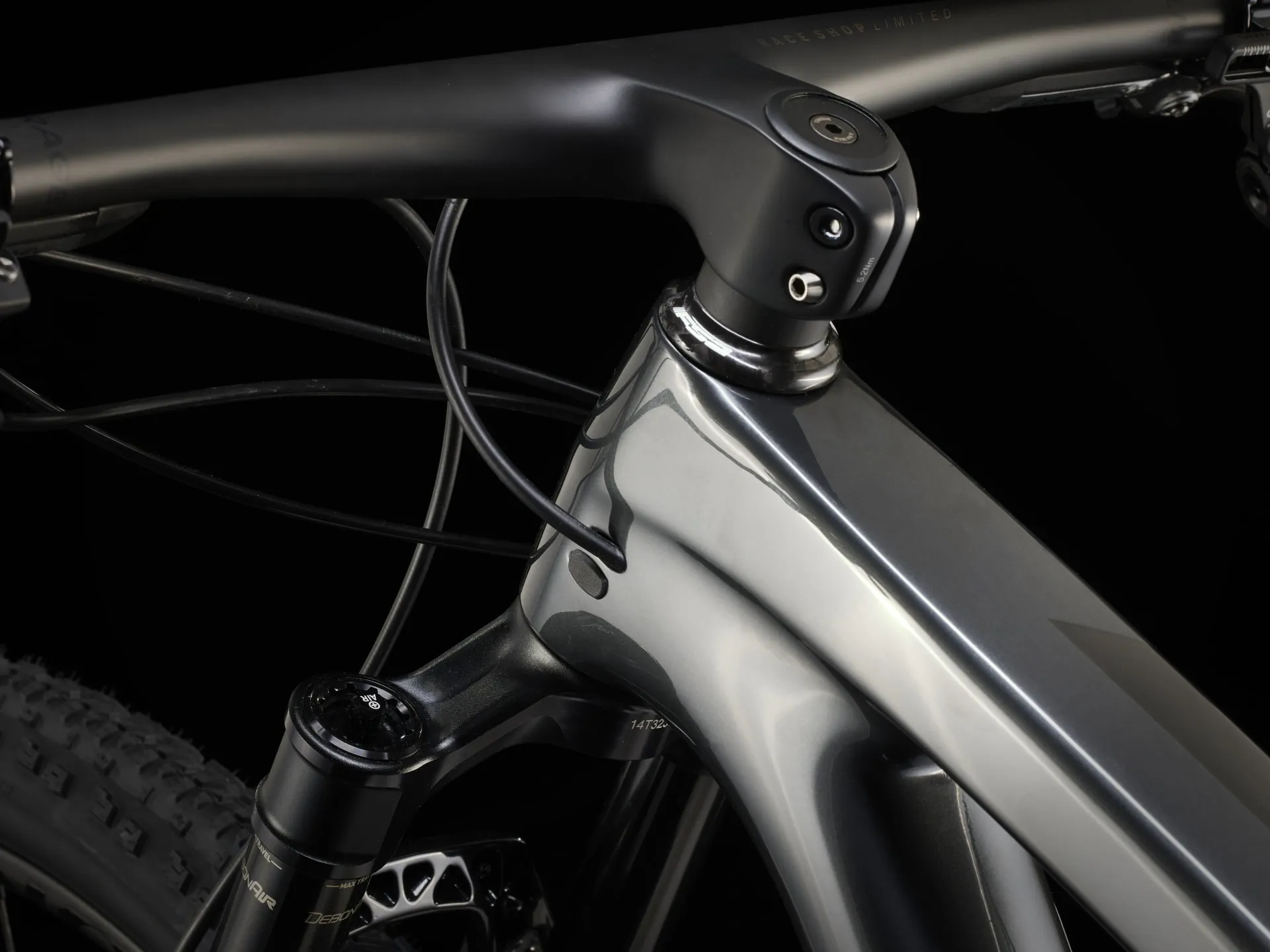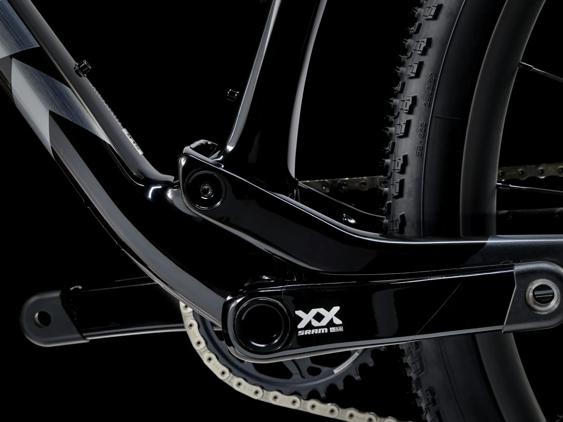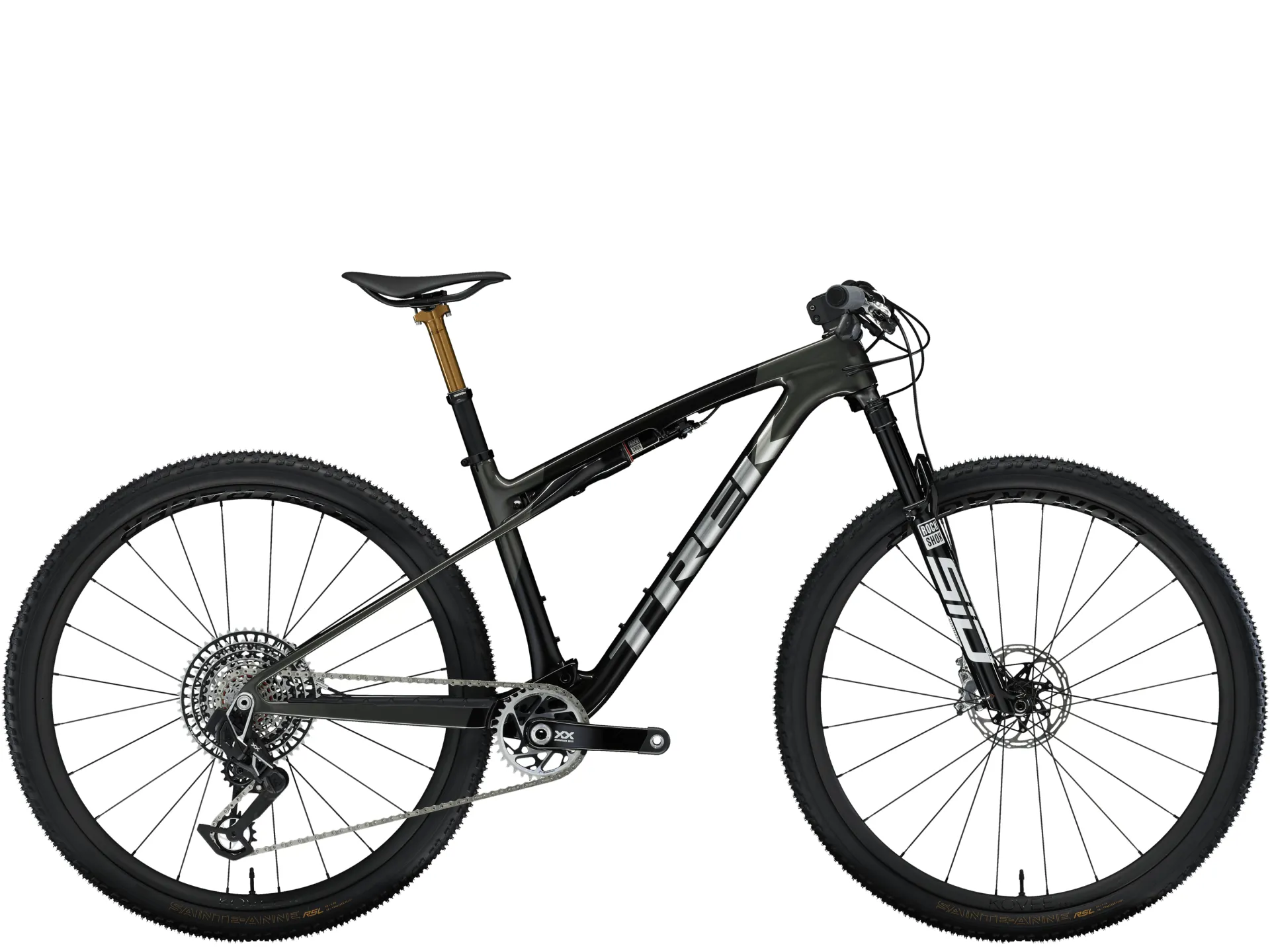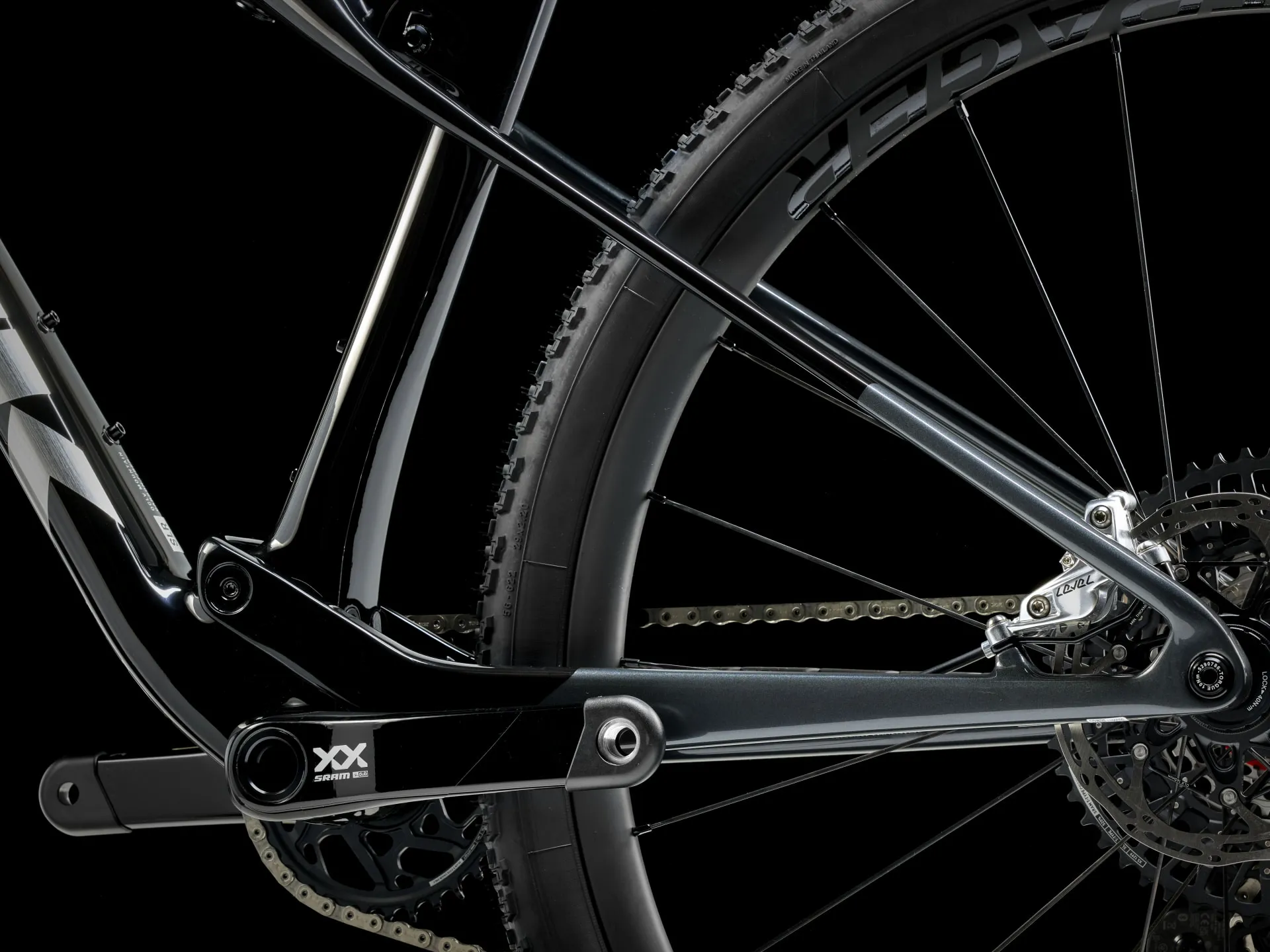 A featherweight, high-modulus SLR OCLV Mountain Carbon frame with modern XC geometry. 110 mm of front suspension from a RockShox SID Ultimate fork with DebonAir spring and Charger Race Day damper and 80 mm of IsoStrut rear suspension from a RockShox SIDLuxe shock – all with remote lockout. An ultra-light, fully wireless SRAM XX SL AXS 12-speed electronic transmission, Bontrager Kovee Elite 23 carbon wheels, carbon Bontrager RSL Integrated bar/stem combo, Bontrager Line Dropper post and SRAM Level Bronze 4-piston hydraulic disc brakes.