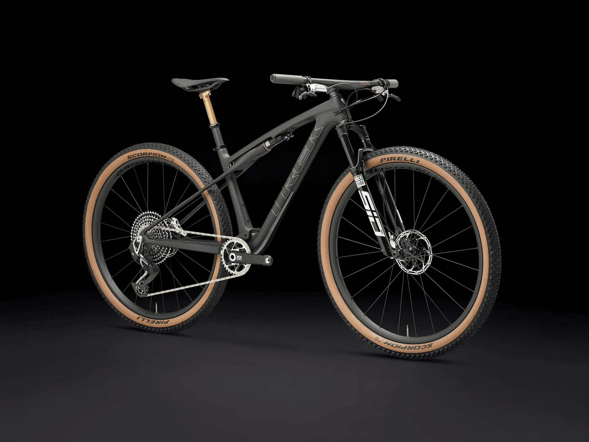 A featherweight, high-modulus SLR OCLV Mountain Carbon frame with modern XC geometry. 110 mm of front suspension from a RockShox SID SL Ultimate fork with DebonAir spring and Charger Race Day damper and 80 mm of IsoStrut rear suspension from a RockShox SIDLuxe shock – all with remote lockout. An ultralight, fully wireless SRAM XX SL AXS 12-speed electronic transmission, Bontrager Kovee RSL carbon wheels, carbon Bontrager RSL Integrated bar/stem combo, Fox Transfer SL dropper post and SRAM Level Ultimate 4-piston hydraulic disc brakes.