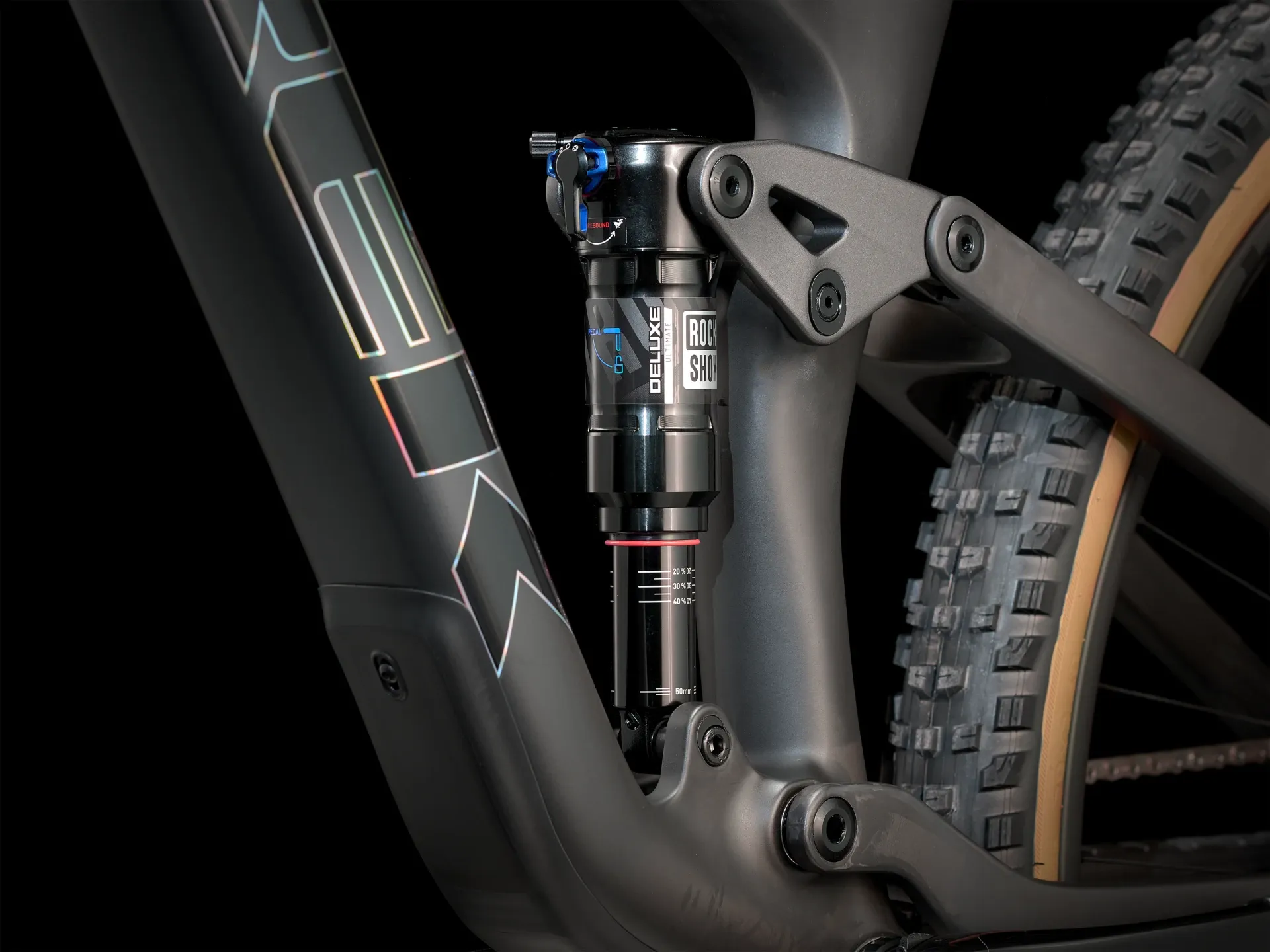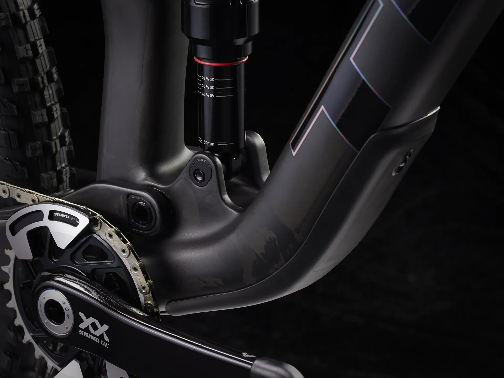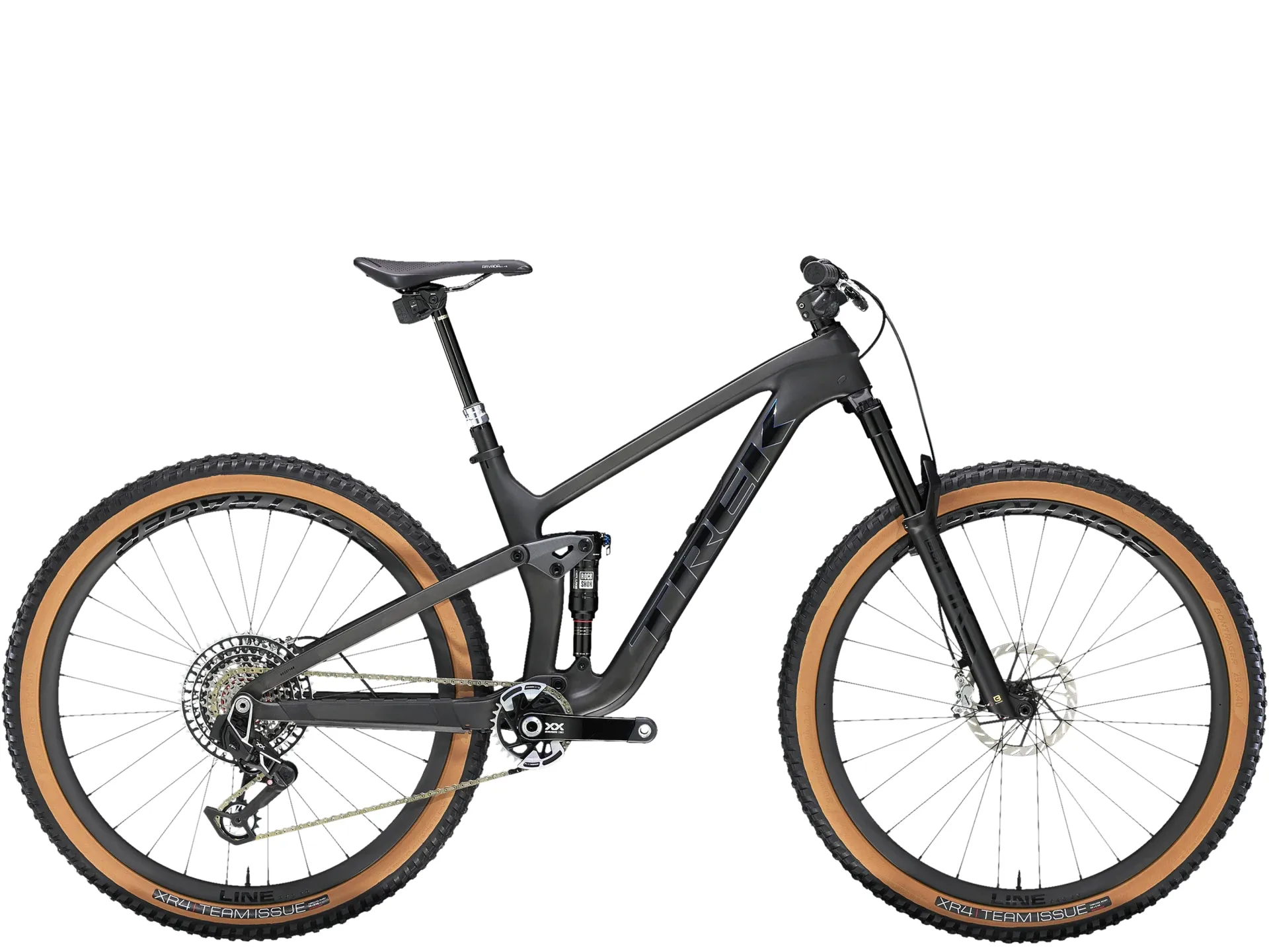 A light and stiff OCLV Mountain Carbon frame, 130 mm RockShox Pike Ultimate fork with DebonAir spring and Charger 3 RC2 damper, 120 mm of rear travel with a RockShox Deluxe Ultimate RCT shock and SRAM's wireless 12-speed XX AXS direct-mount transmission that's as light as it is precise. Plus, a wide carbon Bontrager Line Elite 30 wheels with a 108-tooth Rapid Drive hub for instant engagement, 4-piston brakes for confident descents, a RockShox Reverb AXS Dropper and carbon handlebar/stem combo.
