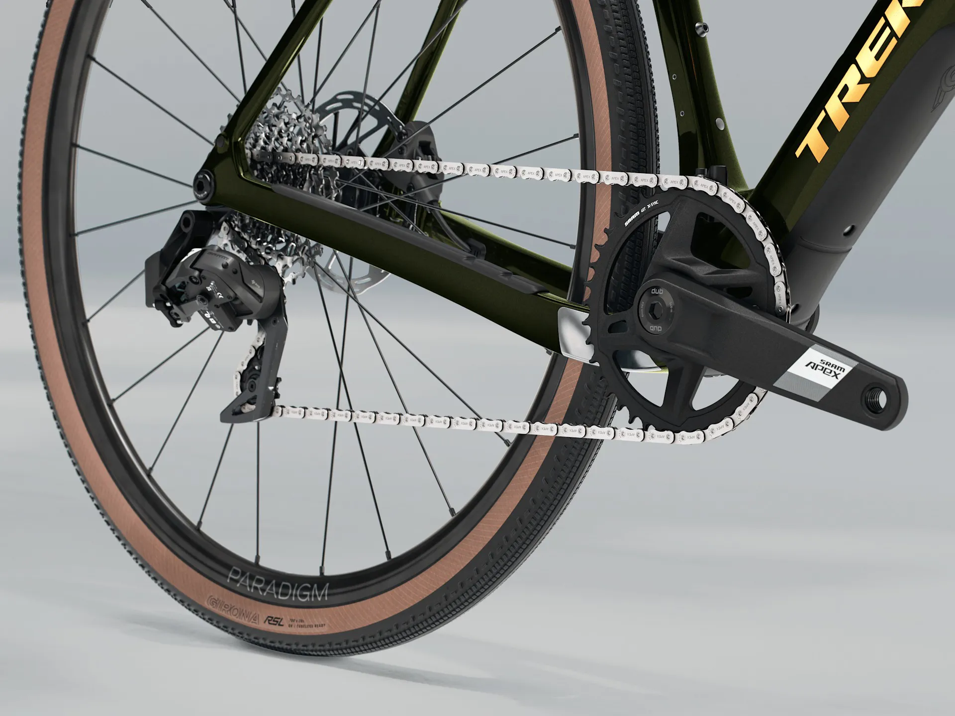 A 500 Series OCLV Carbon frame with a carbon fork, internal downtube storage, frame and fork mounts, and clearance for 50 mm tyres (as measured). A 12-speed 1x SRAM Apex XPLR AXS fully wireless drivetrain, hydraulic disc brakes, carbon seat post, and Tubeless Ready Bontrager Paradigm SL wheels with 42 mm tyres.