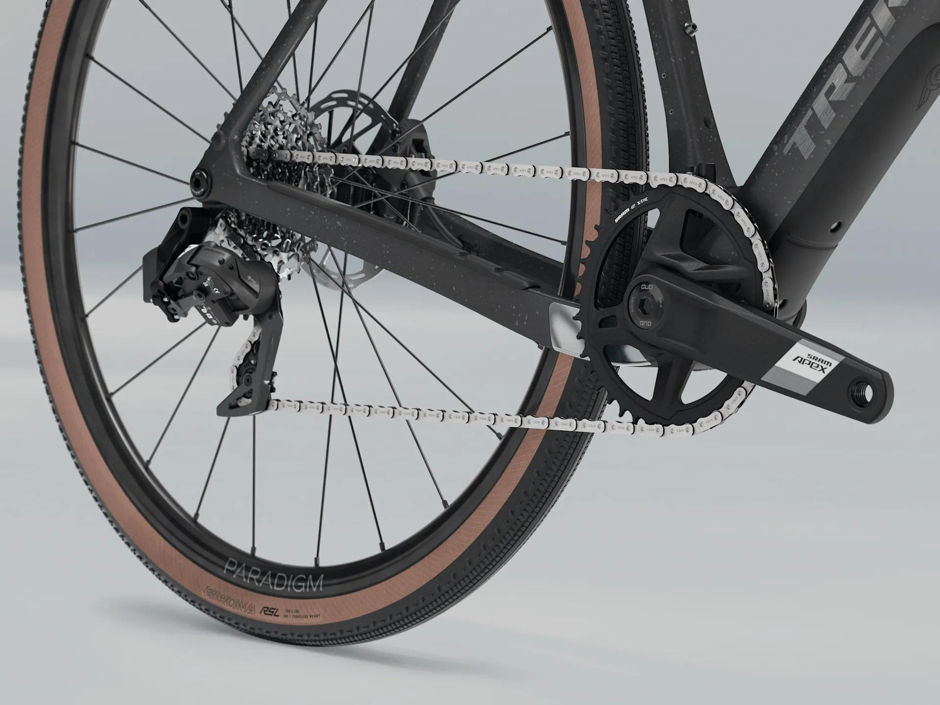 A 500 Series OCLV Carbon frame with a carbon fork, internal downtube storage, frame and fork mounts, and clearance for 50 mm tyres (as measured). A 12-speed 1x SRAM Apex XPLR AXS fully wireless drivetrain, hydraulic disc brakes, carbon seat post, and Tubeless Ready Bontrager Paradigm SL wheels with 42 mm tyres.