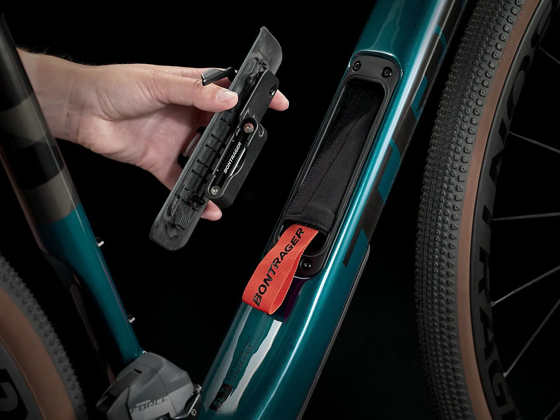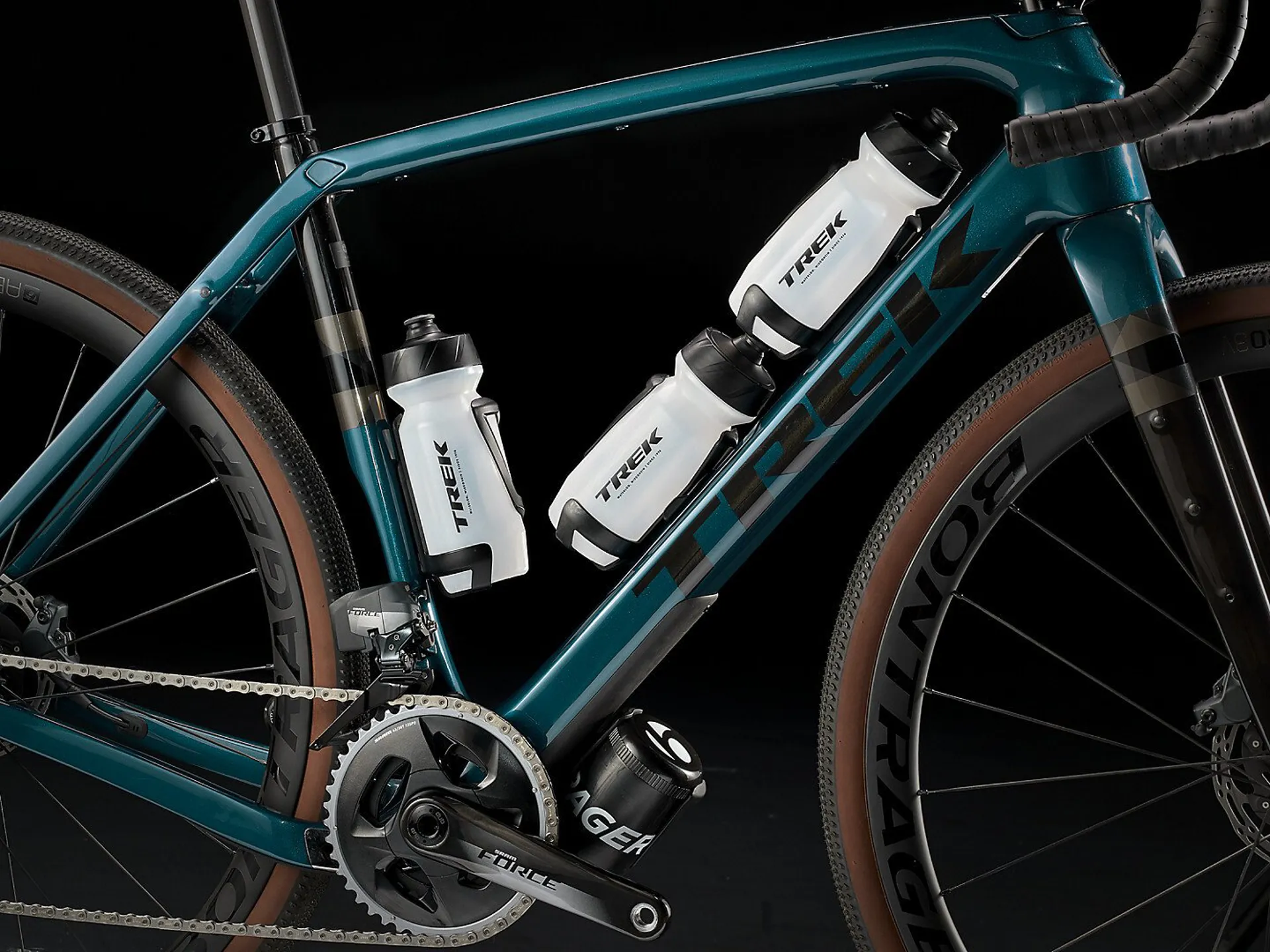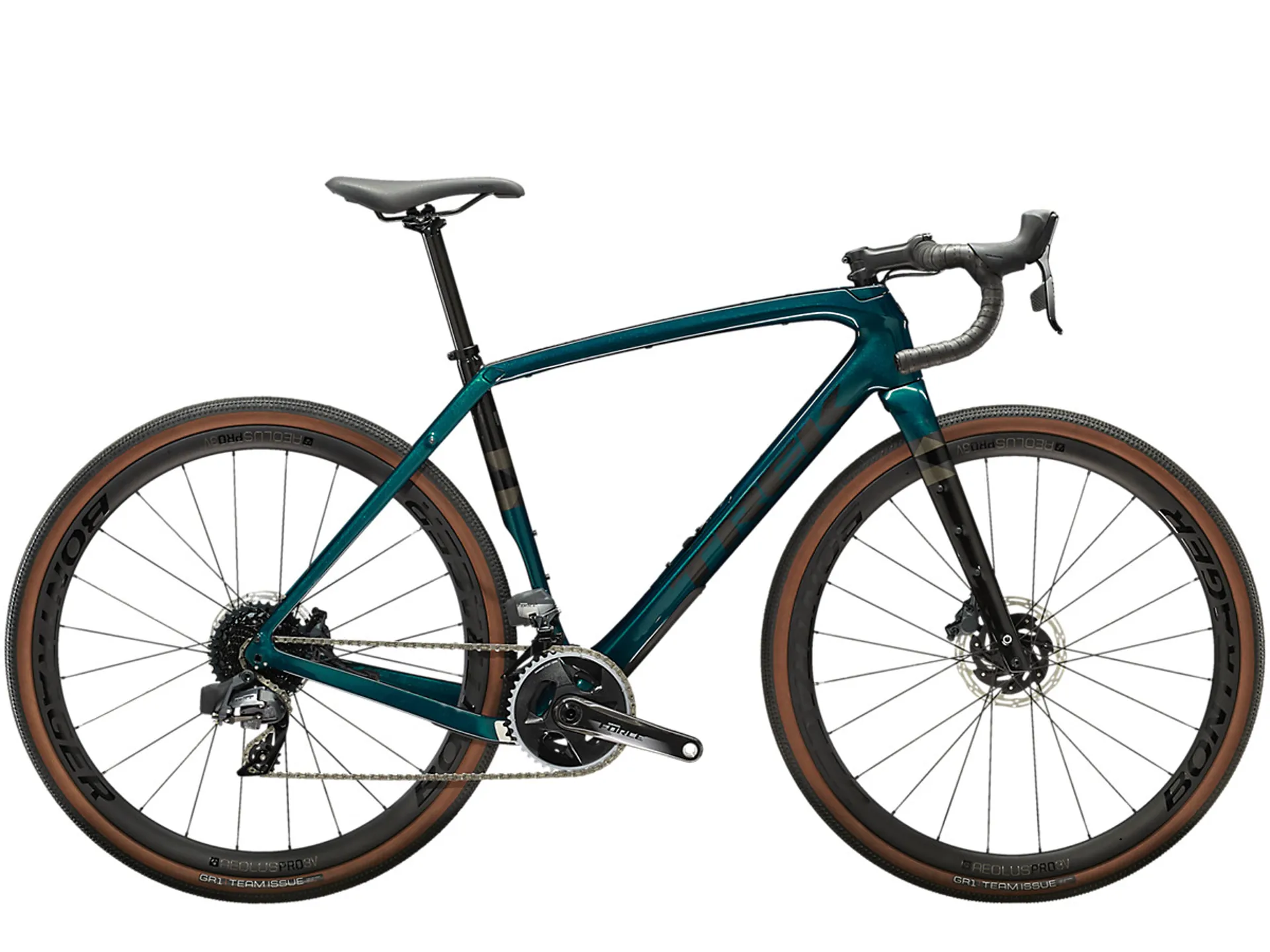 A 500 Series OCLV Carbon frame with damped Rear IsoSpeed and carbon armour, a progressive geometry that's stable at speed and efficient when you're grinding up a climb, internal storage, hidden cables that won't interfere with bags, integrated frame bag mounts and rack and mudguard mounts. Plus, a carbon fork, 2x12 SRAM Force eTap AXS wireless electronic drivetrain with a wide-range cassette and Bontrager Aeolus Pro 3V OCLV Carbon wheels with wide 700x40c gravel tyres that provide extra traction and stability. You can even run a dropper post to get low on long descents. Fits up to 45 c tyres.