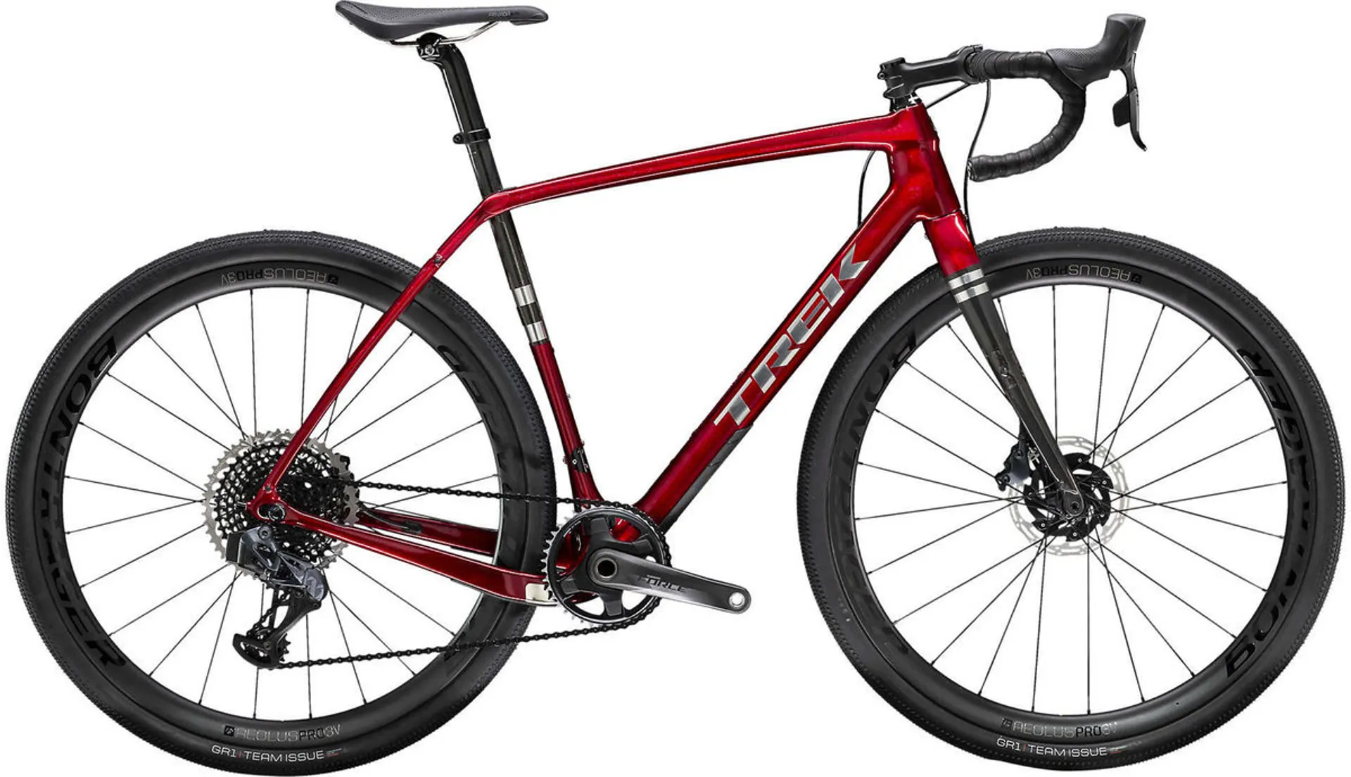 The tech you get is a 500 Series OCLV Carbon frame with Rear IsoSpeed, a SRAM Force/XX1 eTap AXS 1x12 wireless electronic drivetrain with a wide-range cassette, powerful flat-mount hydraulic disc brakes, Bontrager Aeolus OCLV Carbon wheels with 12 mm thru axles and wide 700x40 Bontrager GR1 Team Issue Tubeless Ready gravel tyres that provide extra traction and stability. Plus, a Bontrager Pro IsoCore OCLV handlebar for added comfort, Control Freak internal cable routing and a carbon seat mast cap.